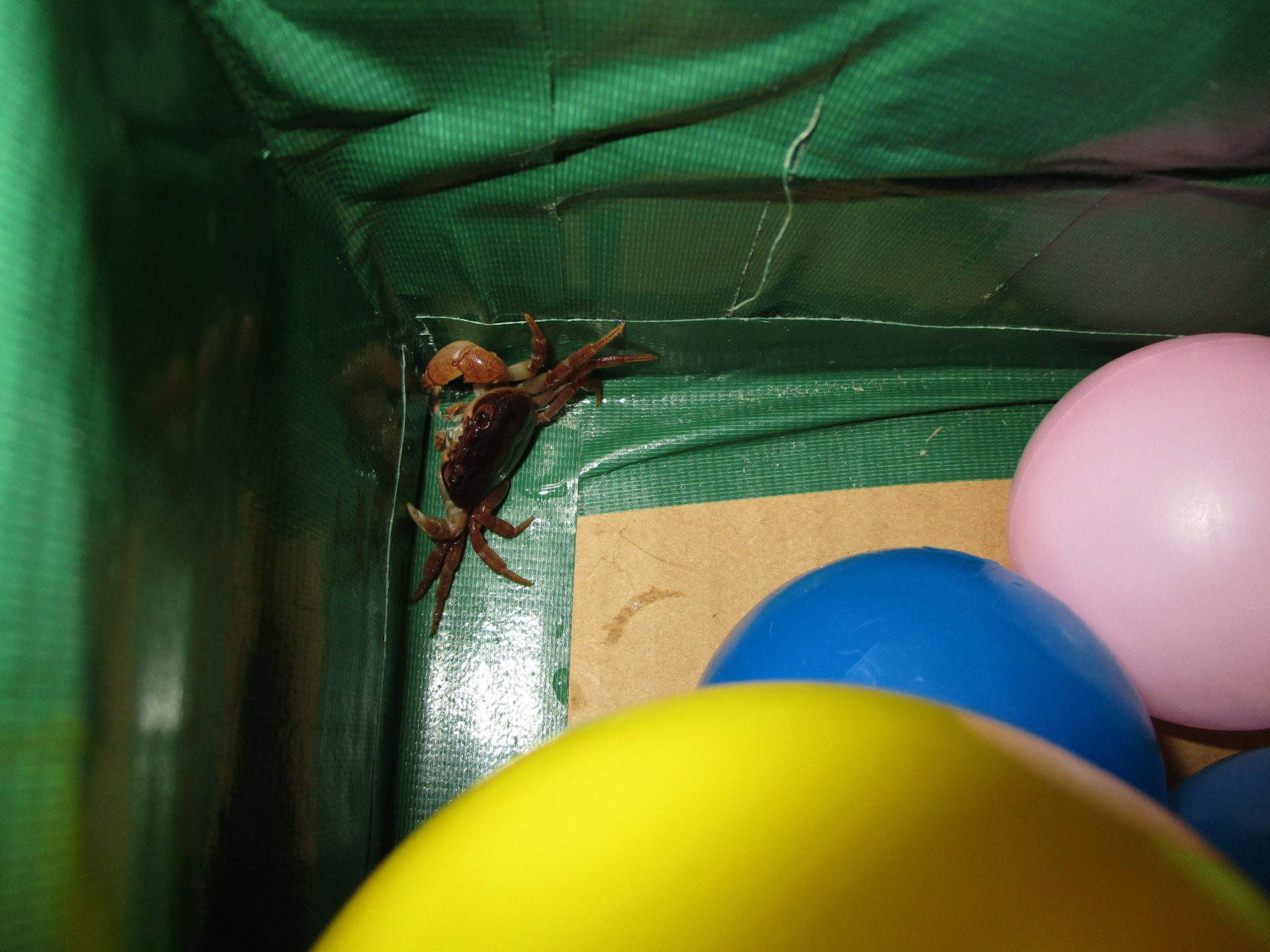 そのサワガニが一番遠く離れた0.1歳児クラスのボールプールの中から見つかったのです!