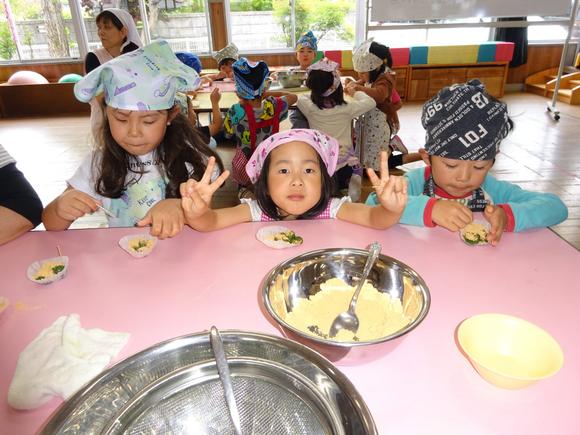 自分達で摘んできたよもぎ、自分達で買ってきた材料でのクッキング。