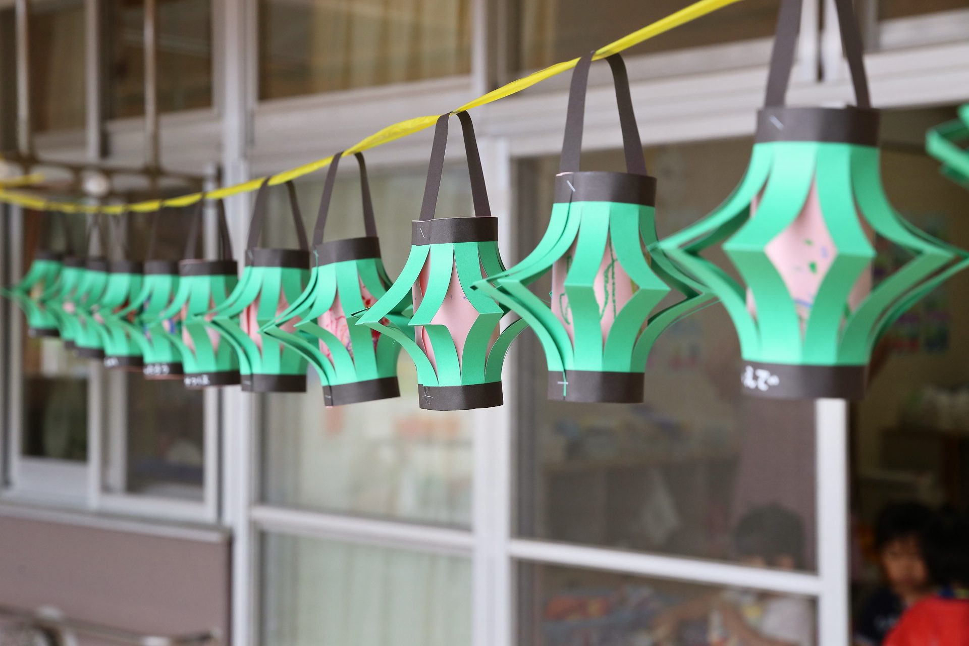 提灯をテラスに飾ると「きょう、おまつりのひ?」と元気に走って登園してきた子ども達。