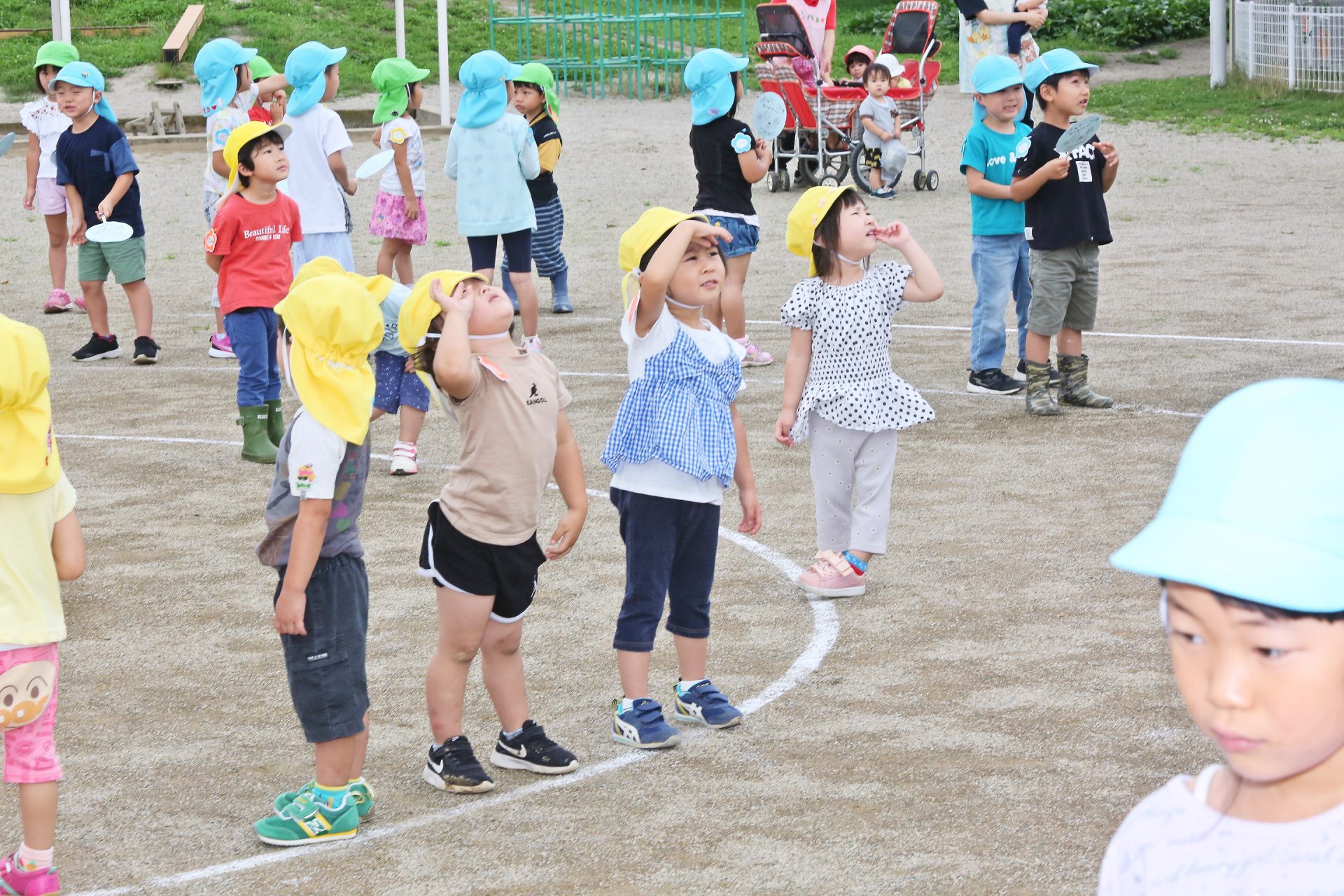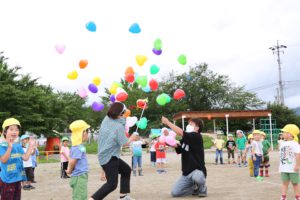 また普段中々経験できない“バルーンリリース”も、保護者会のご協力があり実現できました。それぞれの年齢によって感じ方は様々でしたが、沢山の風船が空に昇っていく様子をずっと見守っていた子ども達でした。