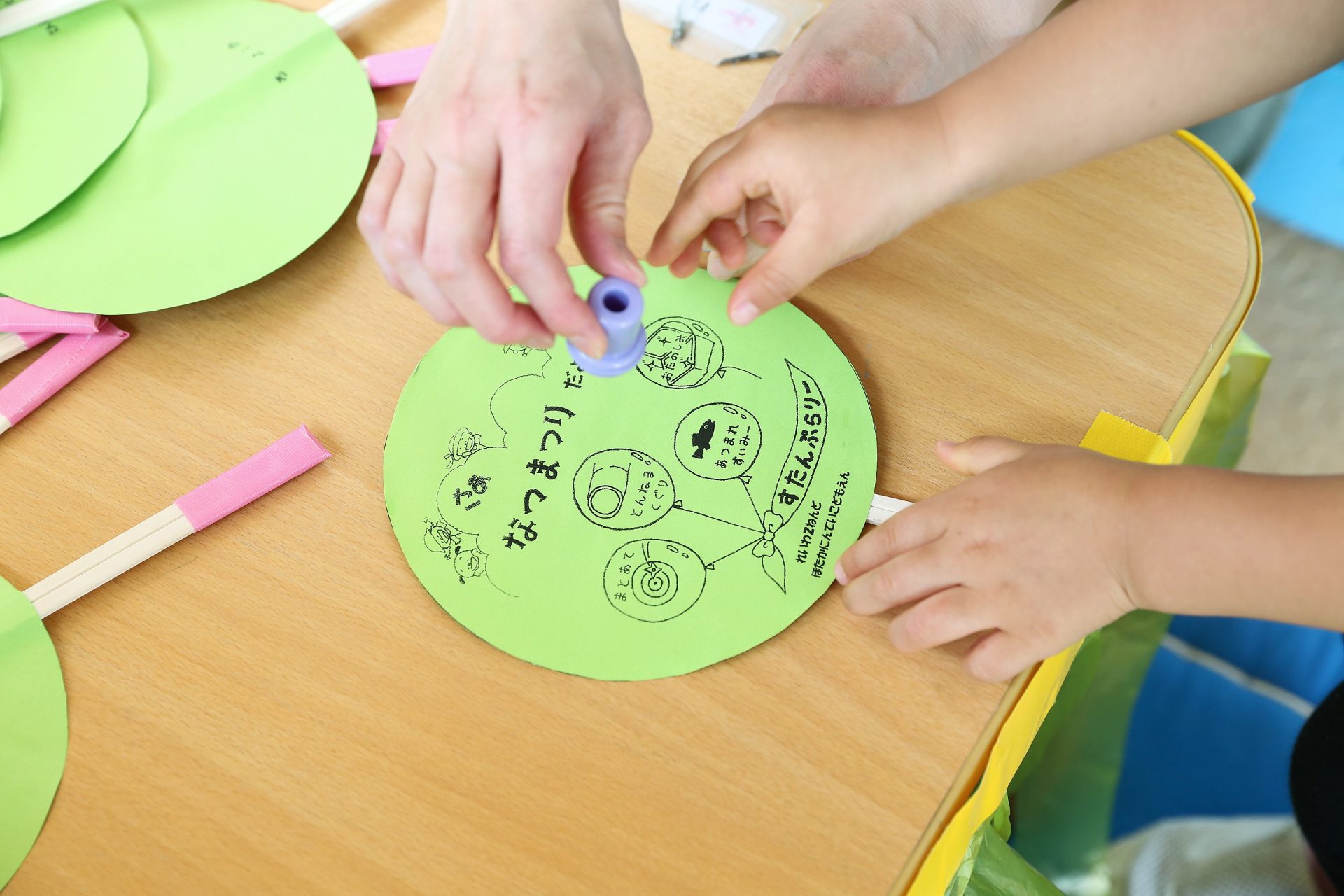 提灯、お魚づくりなど友達や保育士と一緒に準備を進めるなかで、「なつまつりいつ?」と楽しみにしたり、