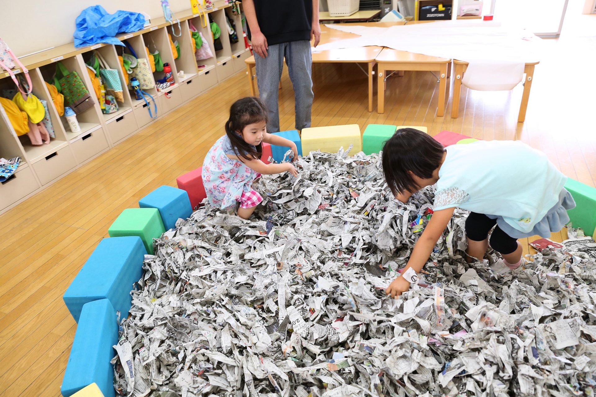 「わ~い、たのしいね!」と友達と顔を見合わせ一緒に新聞プールではしゃぐ姿。