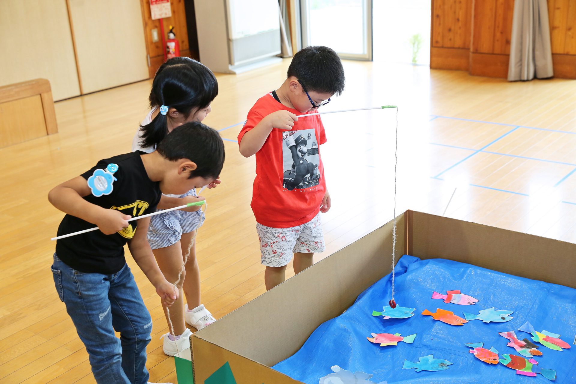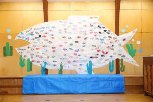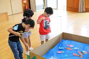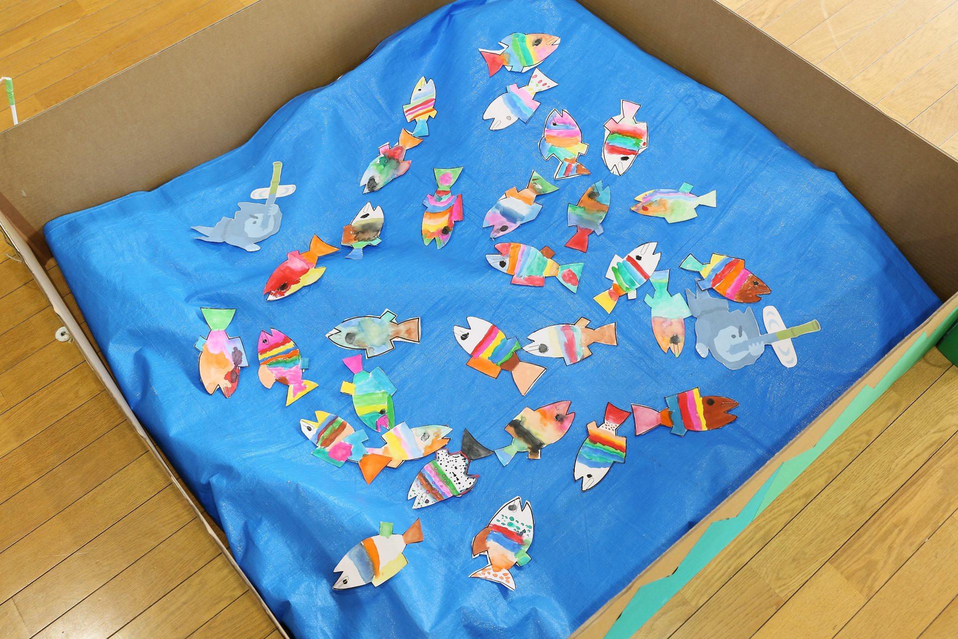中でも”魚釣り”では、子ども達が親しんでいる絵本の世界から・・・1人1匹ずつの「スイミー」を思いを込めて作り、当日はみんなのスイミーを張り合わせ、大きなお魚を完成させました。