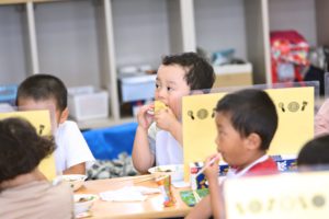 給食は“夏祭り特別メニュー”で、お祭りの出店の雰囲気や気分をみんなで一緒に味わいました。