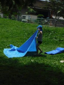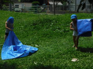 担任がブルーシートを持ち出すと「何するの?」と興味を示し、敷くのを手伝う。