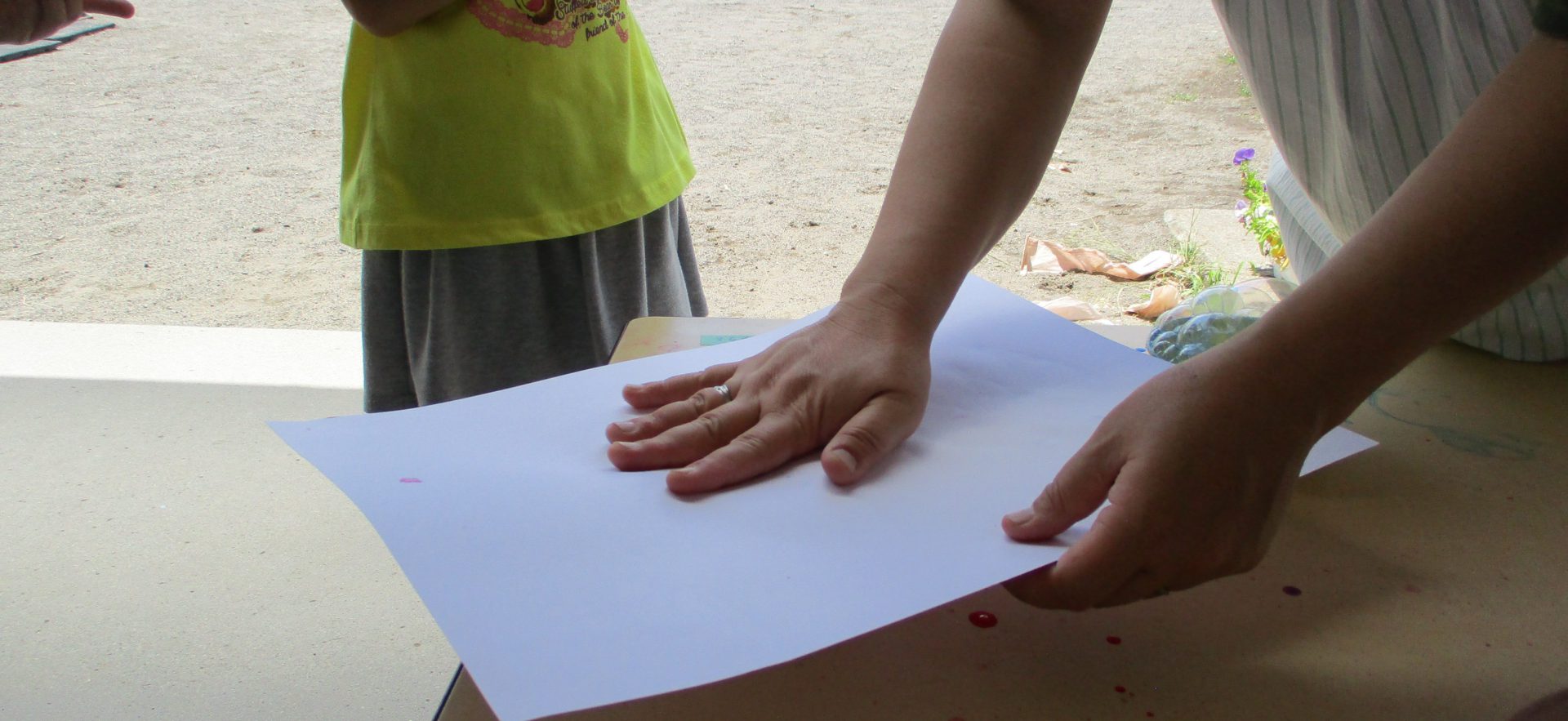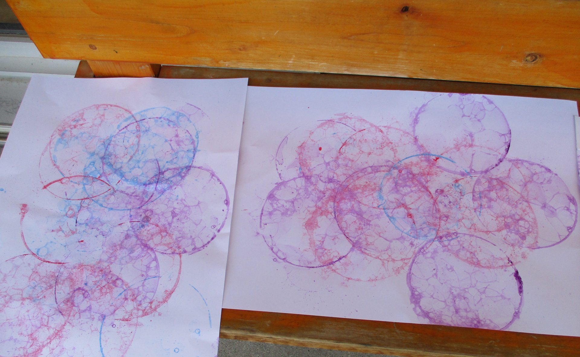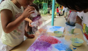 3歳児がしゃぼん玉遊びをしているところを見て「しゃぼん玉って飛んでいるときはキラキラしているけれど、紙につけると色が消えちゃうね。どうしたら紙に色がつけられるかなぁ?」