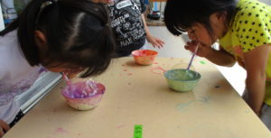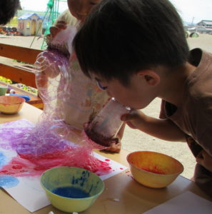 飛んでいるしゃぼん玉を見て「キラキラできれい!」と感じながら、そのキラキラがどうして紙には写らないのか不思議に思う、その子どもなりの視点のおもしろさを感じ、活動を広げ楽しみました。「紙の色を変えたら?」「絵具をいれたら?」「○○を使ってみようよ」と保育士や友達とアイディアを出し合い、試行錯誤して遊ぶ子ども達は生き生きとしていました。