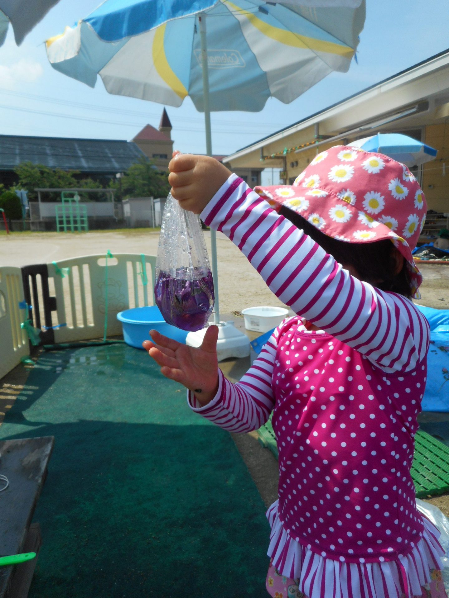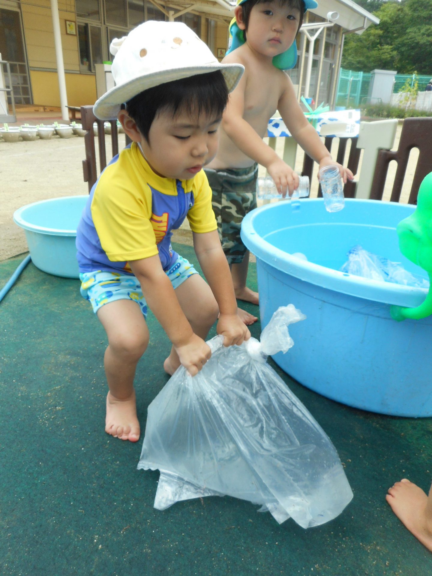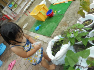 水の冷たさ、陽だまりの温かさ、ビニール袋に触れた感触など、手だけでなく、足や腕、体全部を使って感じています。一人ひとりがそれぞれのペースで自分の楽しみを十分に味わい、感じて欲しいと思いました。