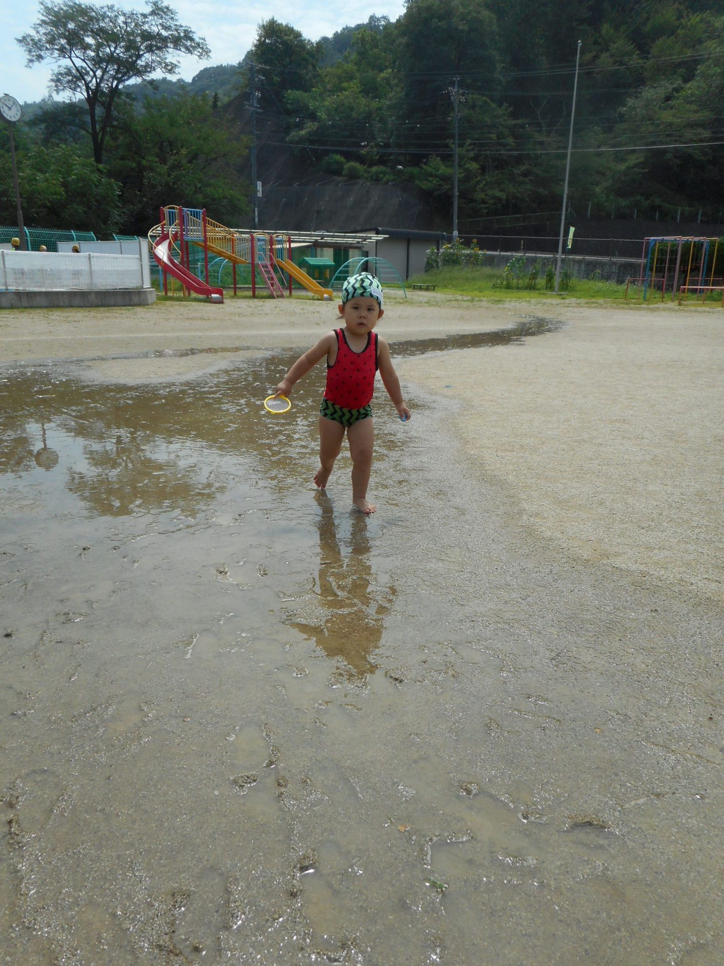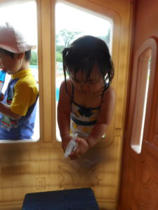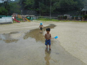 園庭の水たまりはもちろん、手を洗いに行った水道でさえ いつの間にか水を飛ばしてあそび始めるりす組さん。みんな水あそびが大好き。