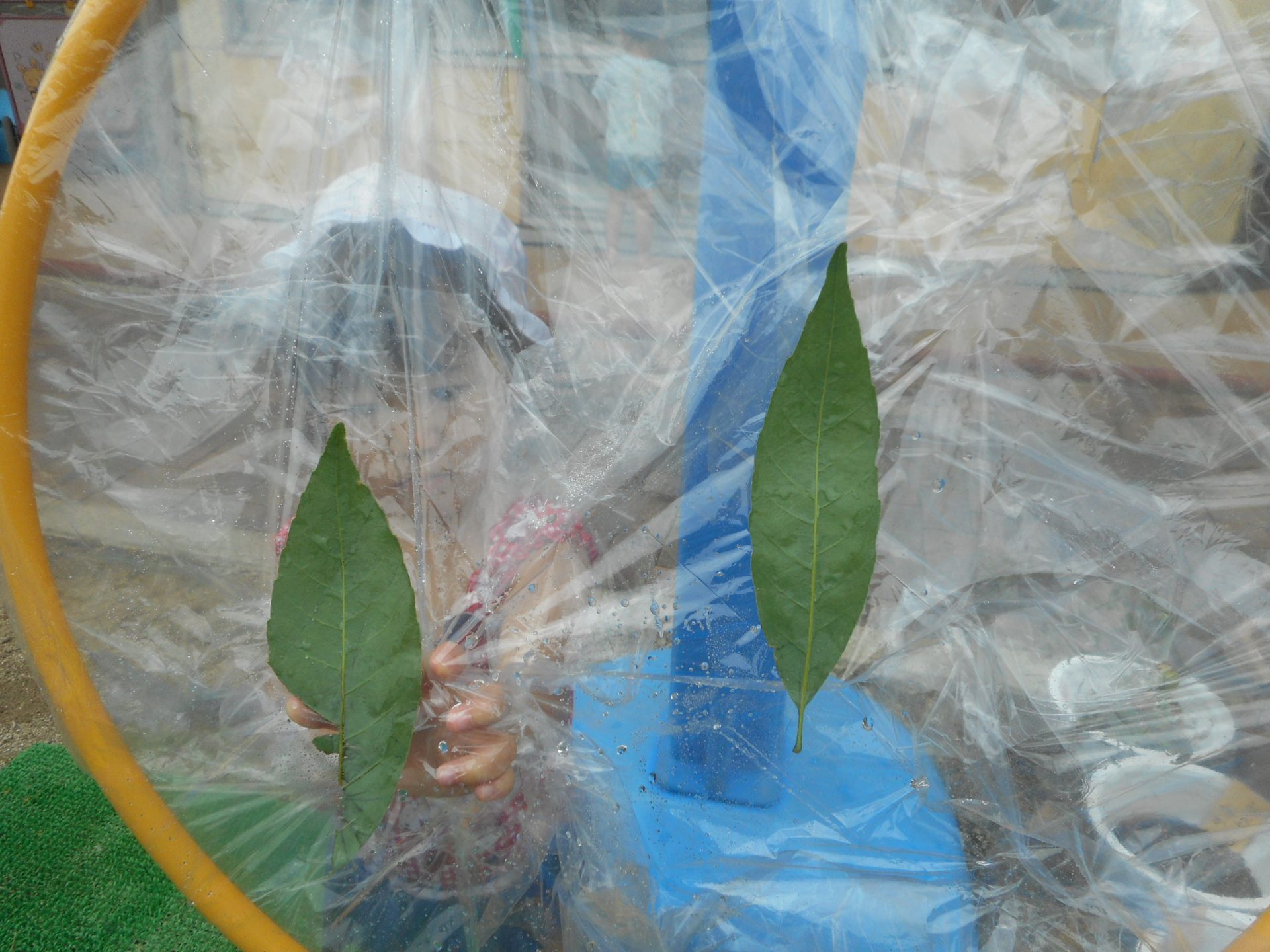 あれ?葉っぱくっついたよ。すると向こう側から「エーイ、お水かけちゃうぞ」