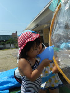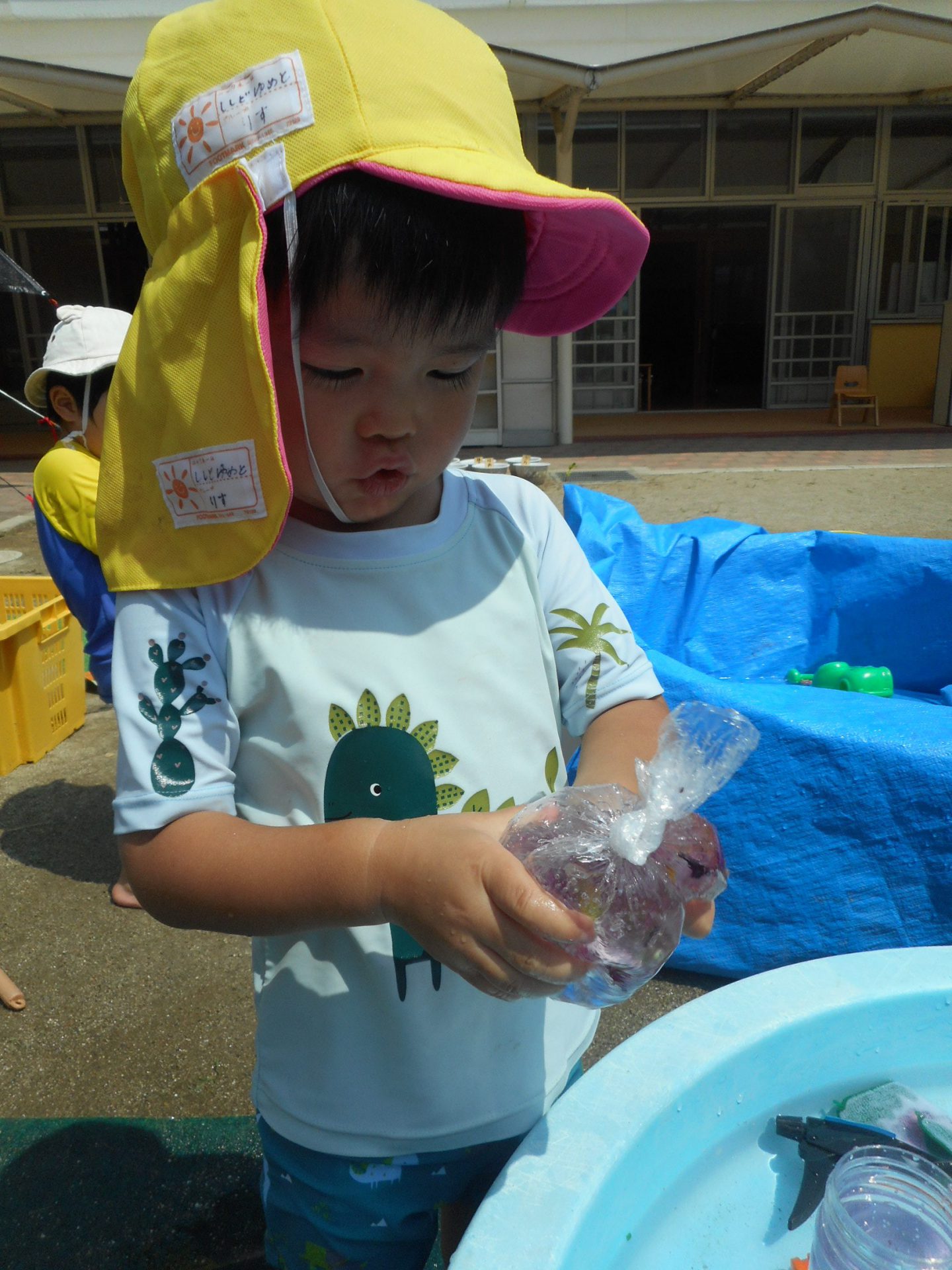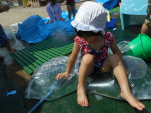 ヨーヨーみたいに伸び縮みしているビニール袋をもみもみ。その横では水でふくらんだゴム手袋を不思議そうにさわるさーちゃん