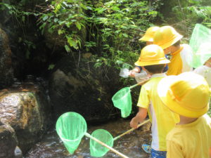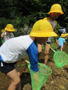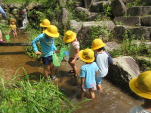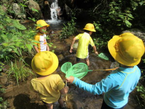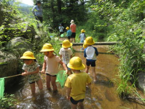 春の遠足に続いてのネバーランド。今回は川遊びです。昨年も川遊びをしている年中、年長の子どもたちは、慣れたようすで川にどんどん入っていきます。それに続けと、年少の子どもたちもあとをついて行きます。