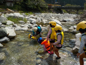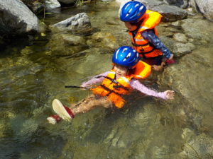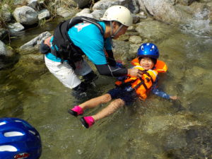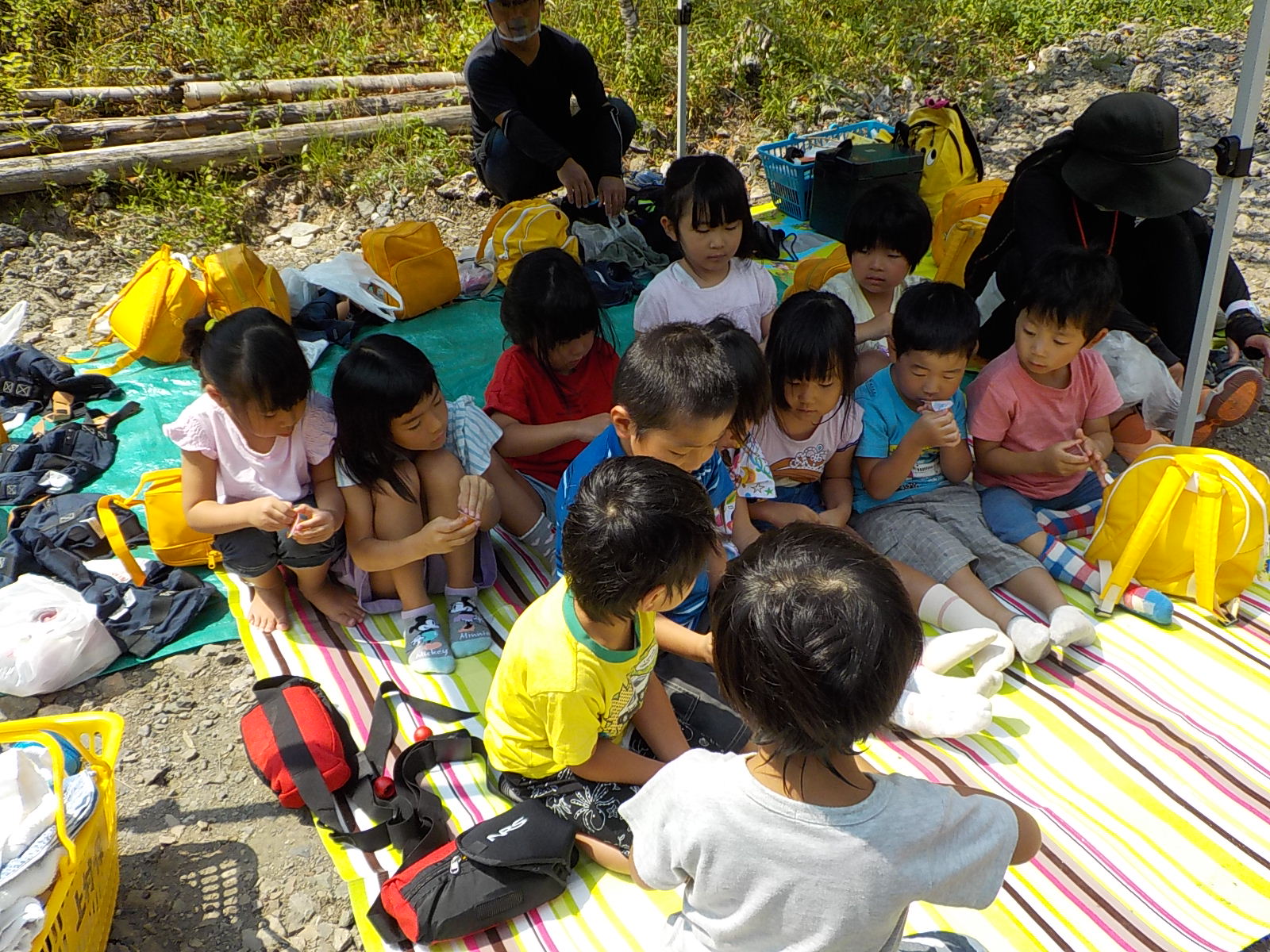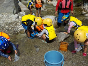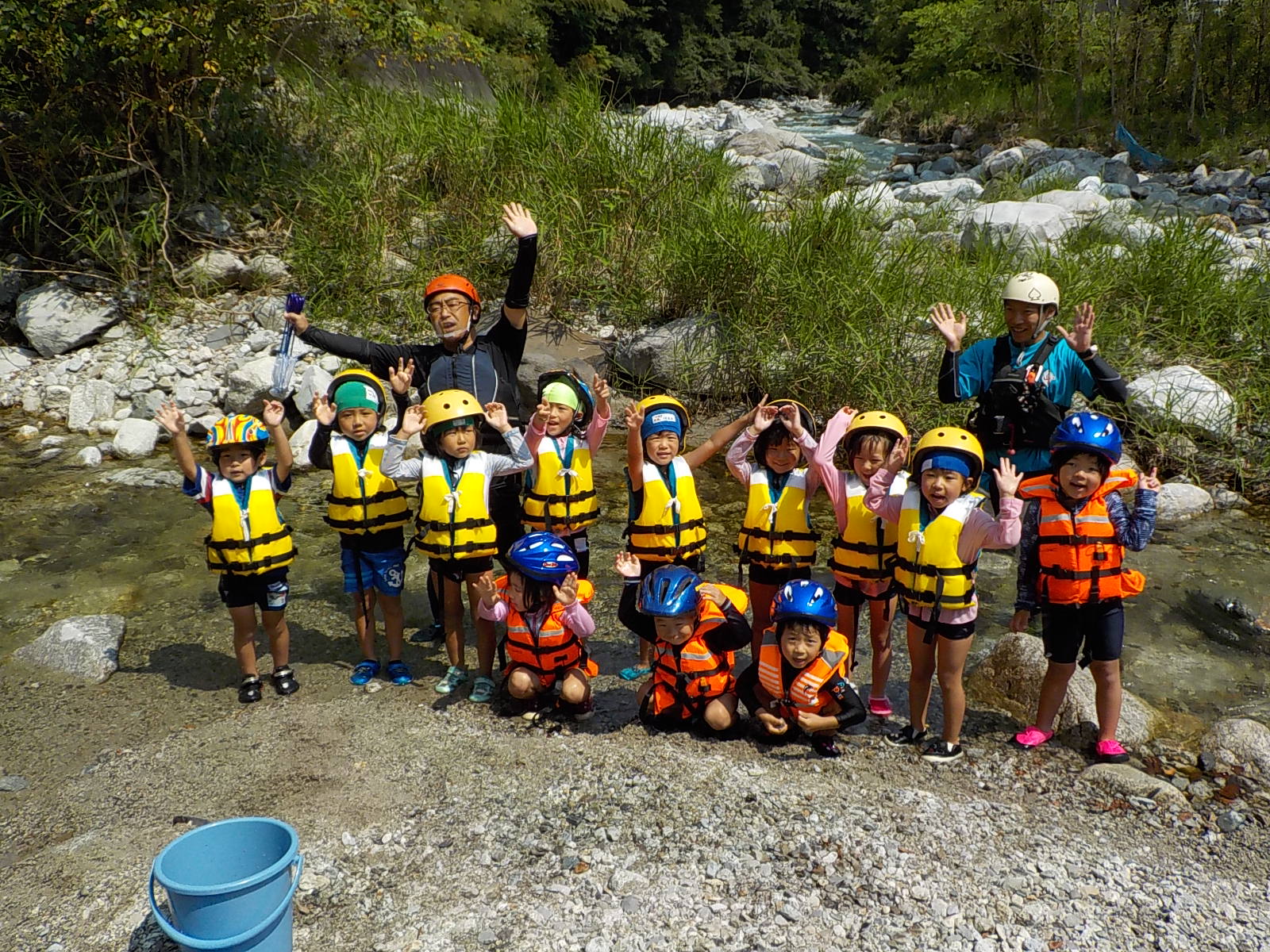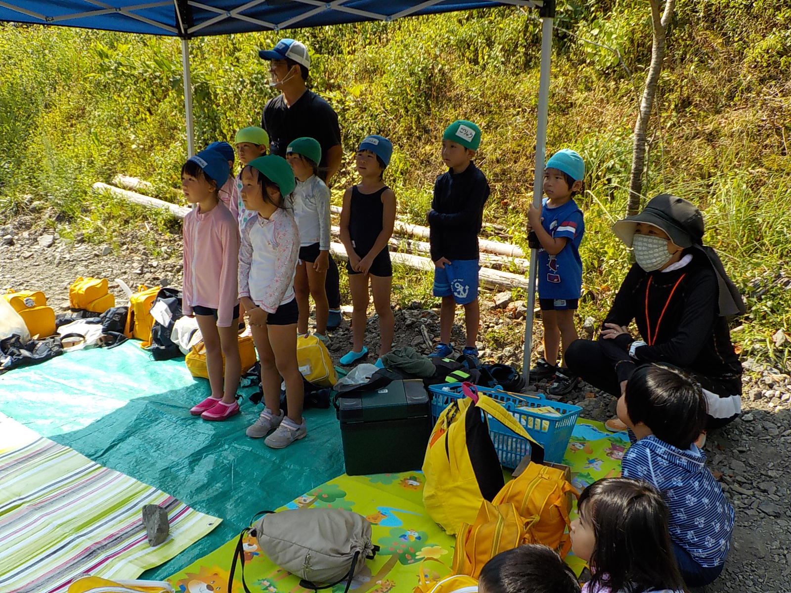 今年は7月の豪雨で伊藤沢も上流から倒木や石が流れ、沢へ降りるところも流されてしまいました。伊藤沢では遊べないとあきらめていましたが、地域のみなさんが整備してくださりこの日を迎えられました。他にも子どもたちが安全に遊べるように、ボランティアで地元遠山地区のお兄さんも来てくれました。たくさんの人に支えられて安全に遊ぶことができることに感謝する気持ちを持ってもらいたいことと、川の中は思うように歩けなかったり、長く水に入っていると身体が冷たくなったりなどの自然の怖さを知り、ルールを守って遊ぶことを覚えてもらいたいと思います。