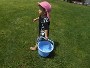「ぼくもー」「わたしもー」とバケツに水を入れて運びます。