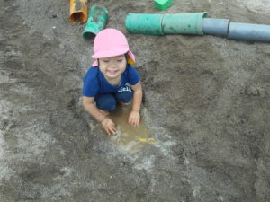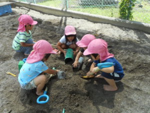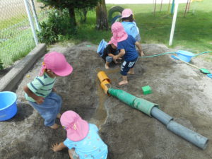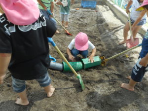 未満児室の前にも砂場はありますが、今日は3歳以上児さんたちが遊んでいる大きな砂場です。いつも一緒に遊んでくれるお兄さんお姉さんは畑の草取りに行き留守中。「帰ってきたら見てもらおう!」と一緒にした遊びを思い出しながら”川づくり”を張り切って始めました。