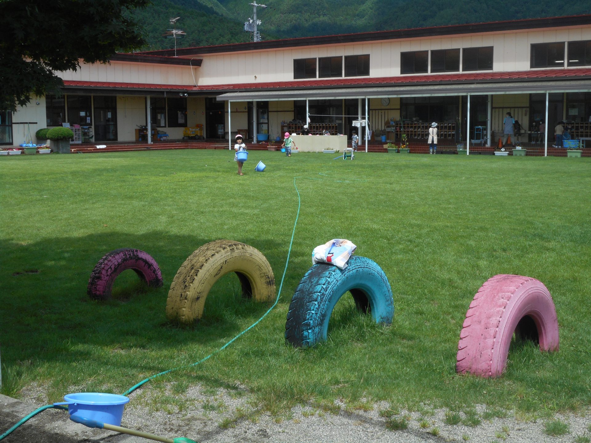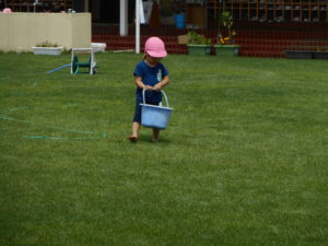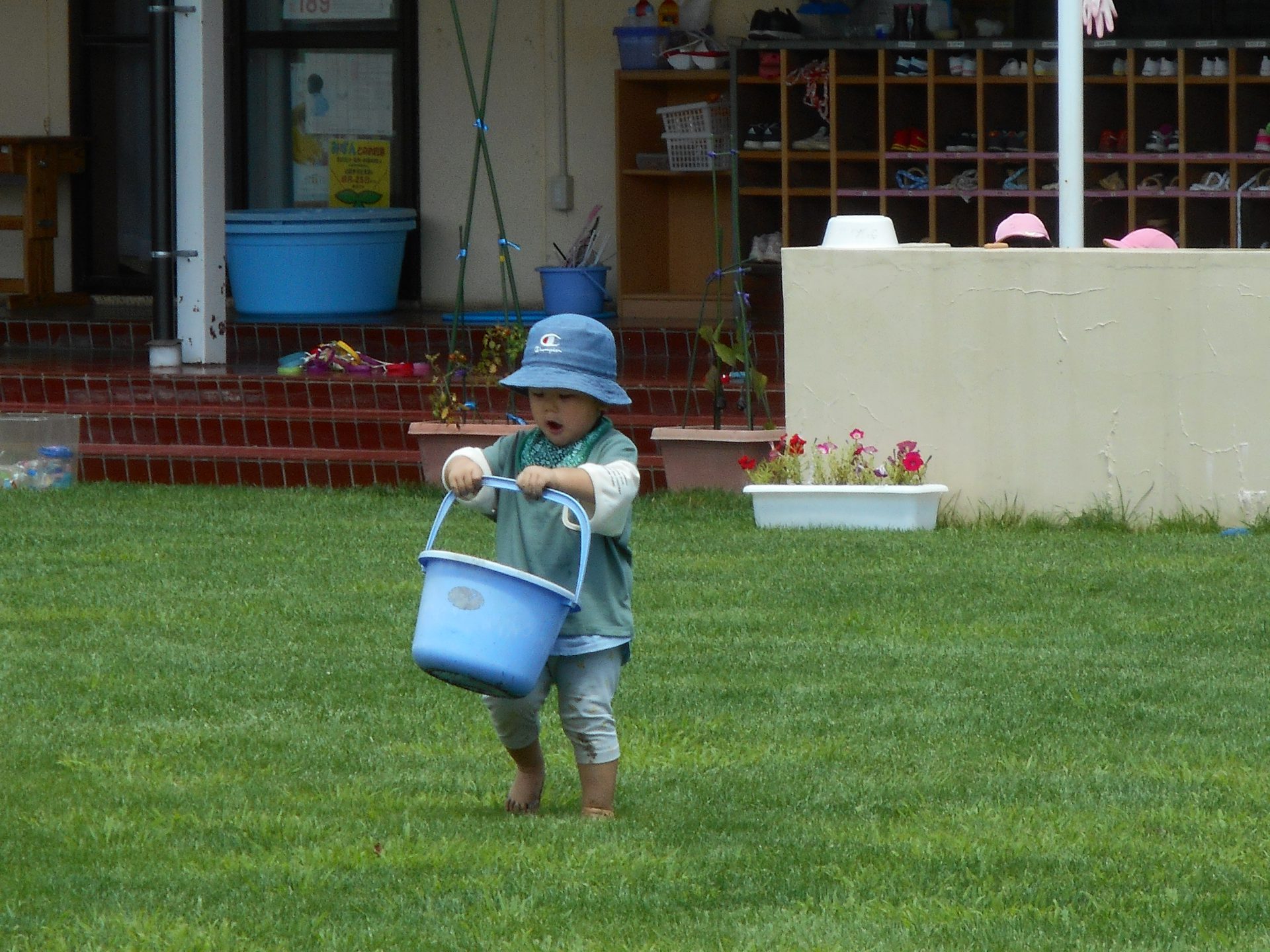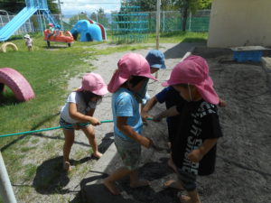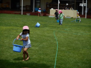 自分たちでどんどんホースを砂場に引っ張ったり、バケツに水を入れて運んだりする姿を見守りながら、3歳以上児さんの遊びをよく見ていたんだなあ、と感心し、”やろう”とするパワーにも感心しました。
