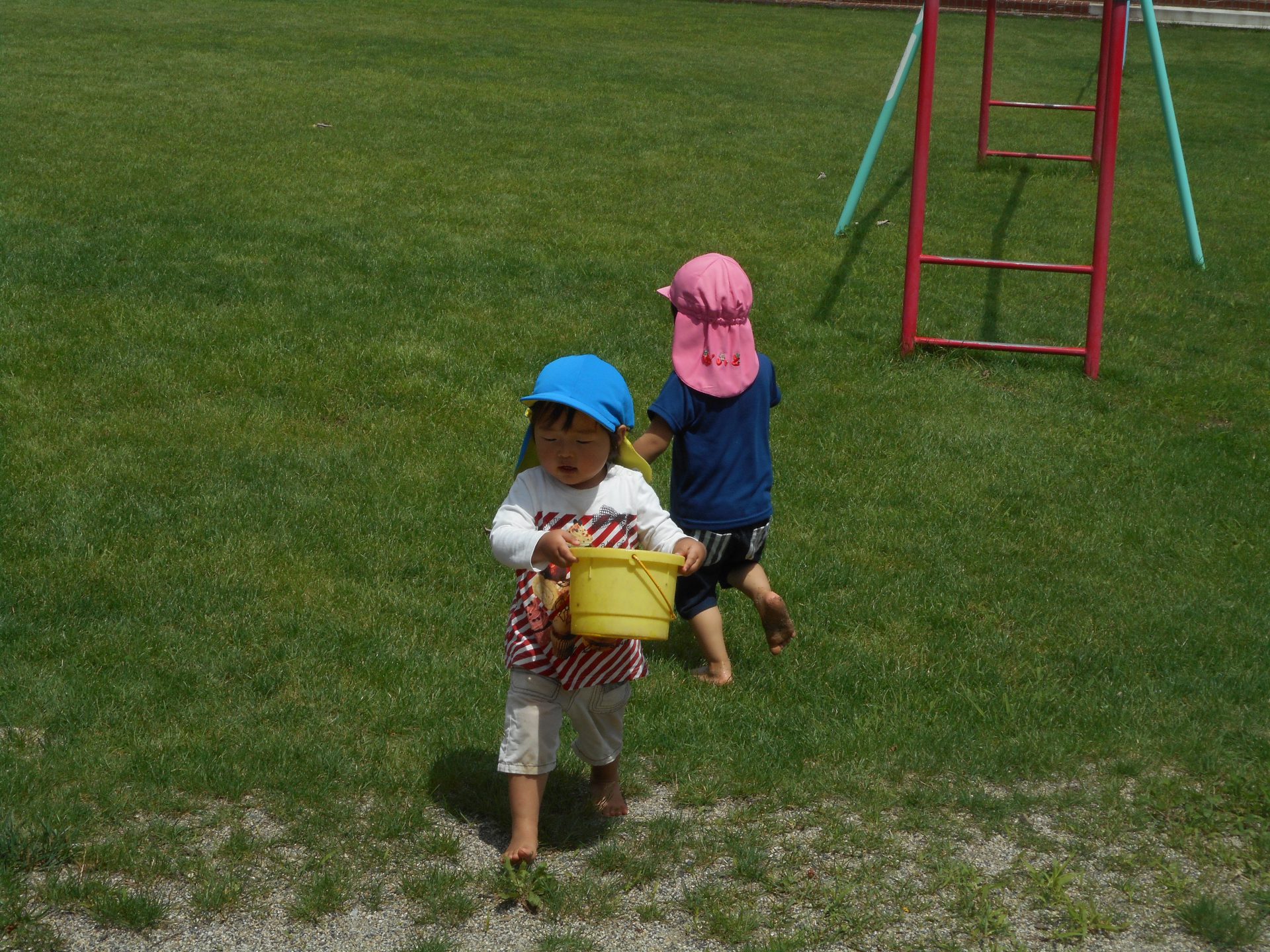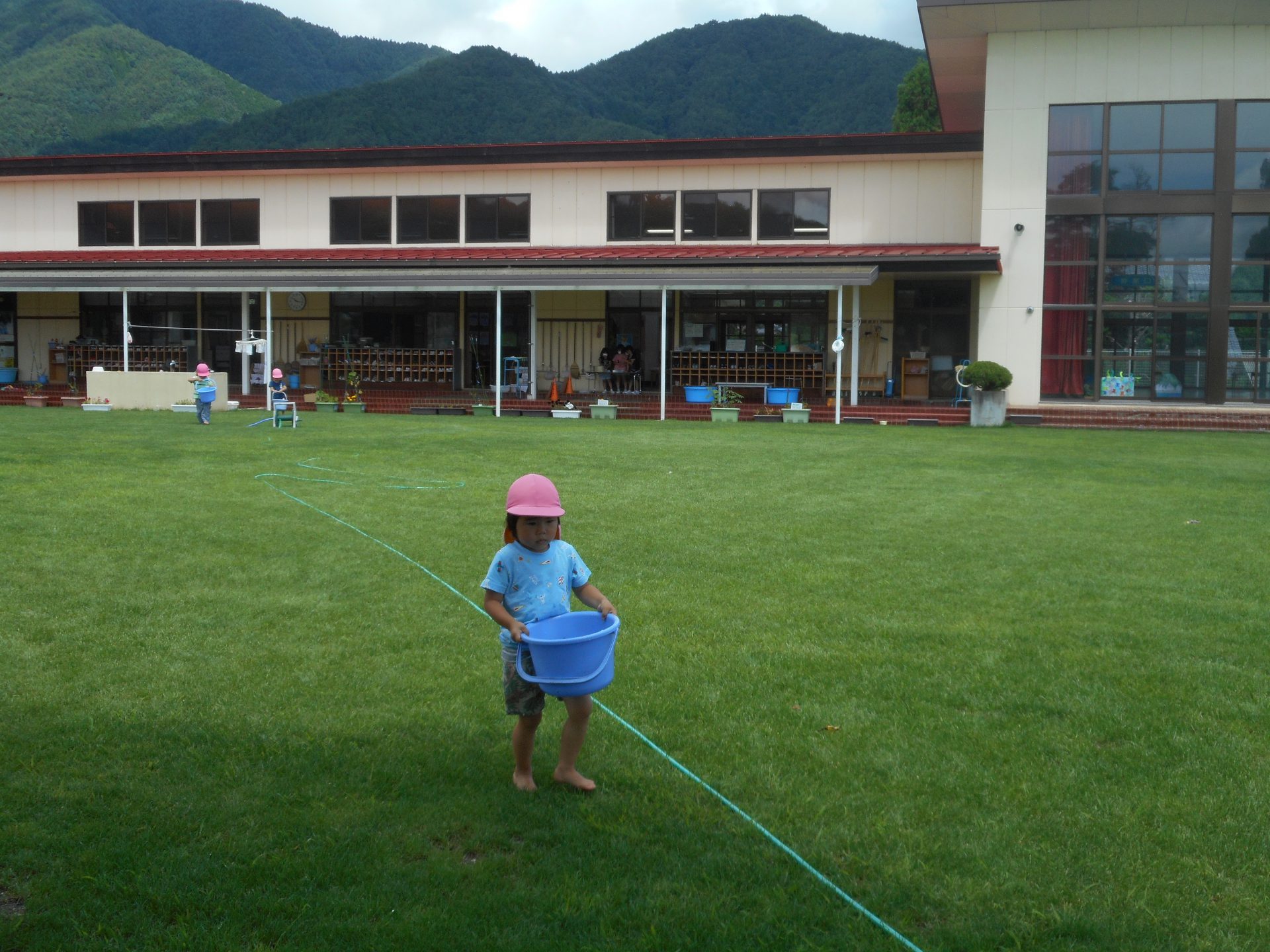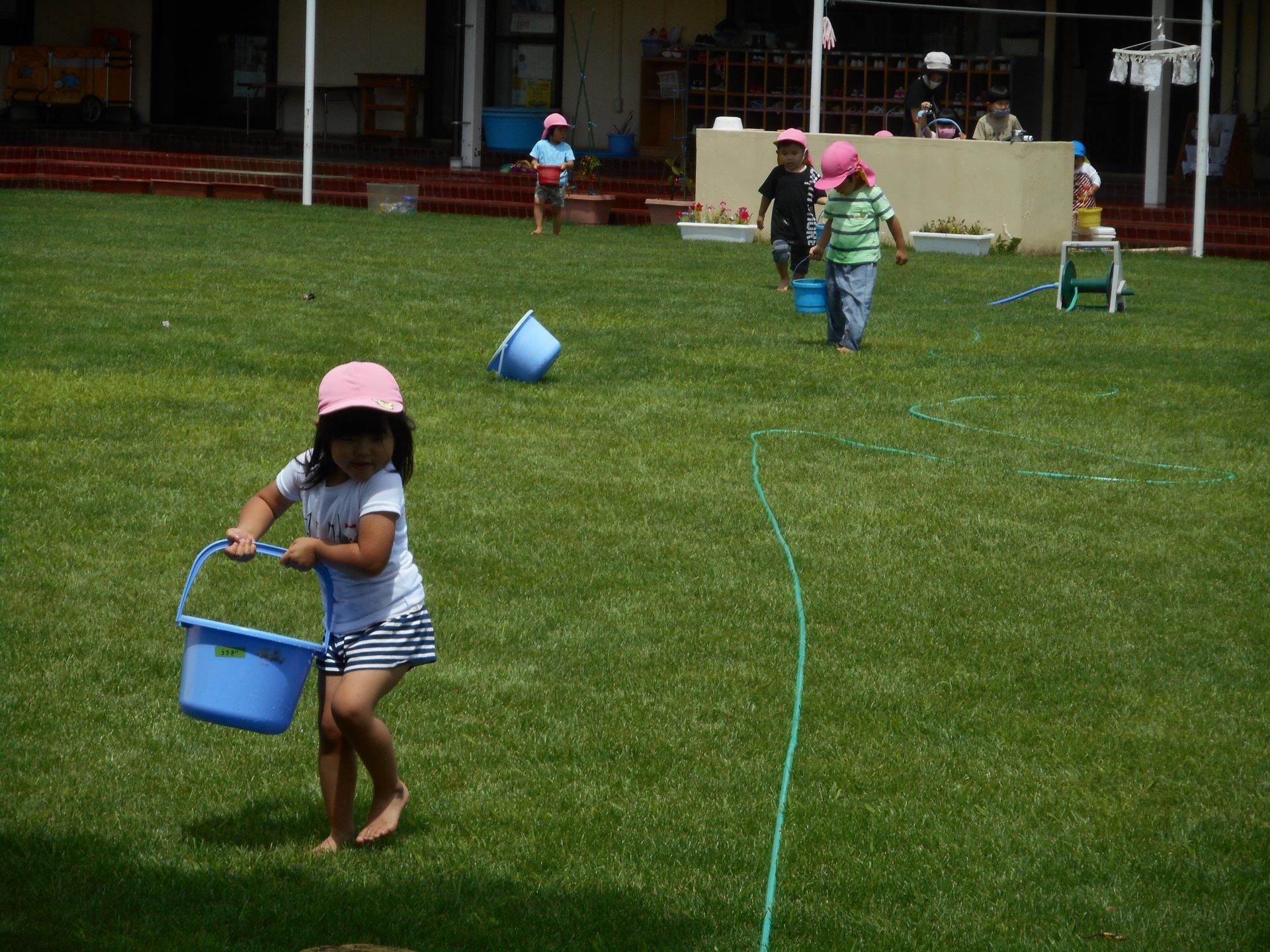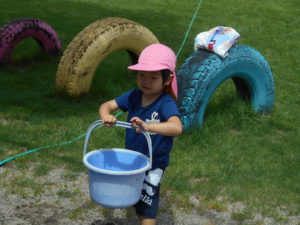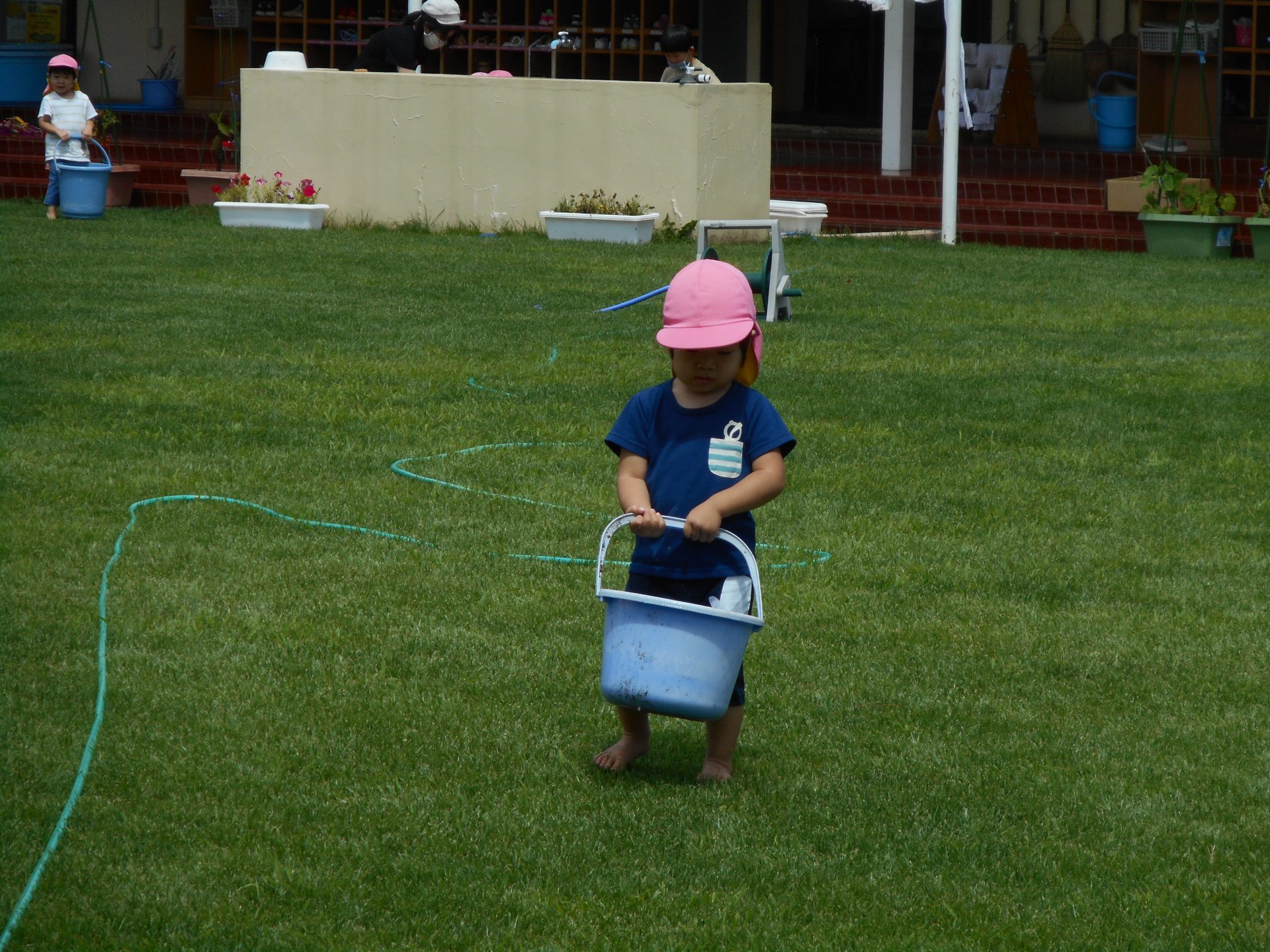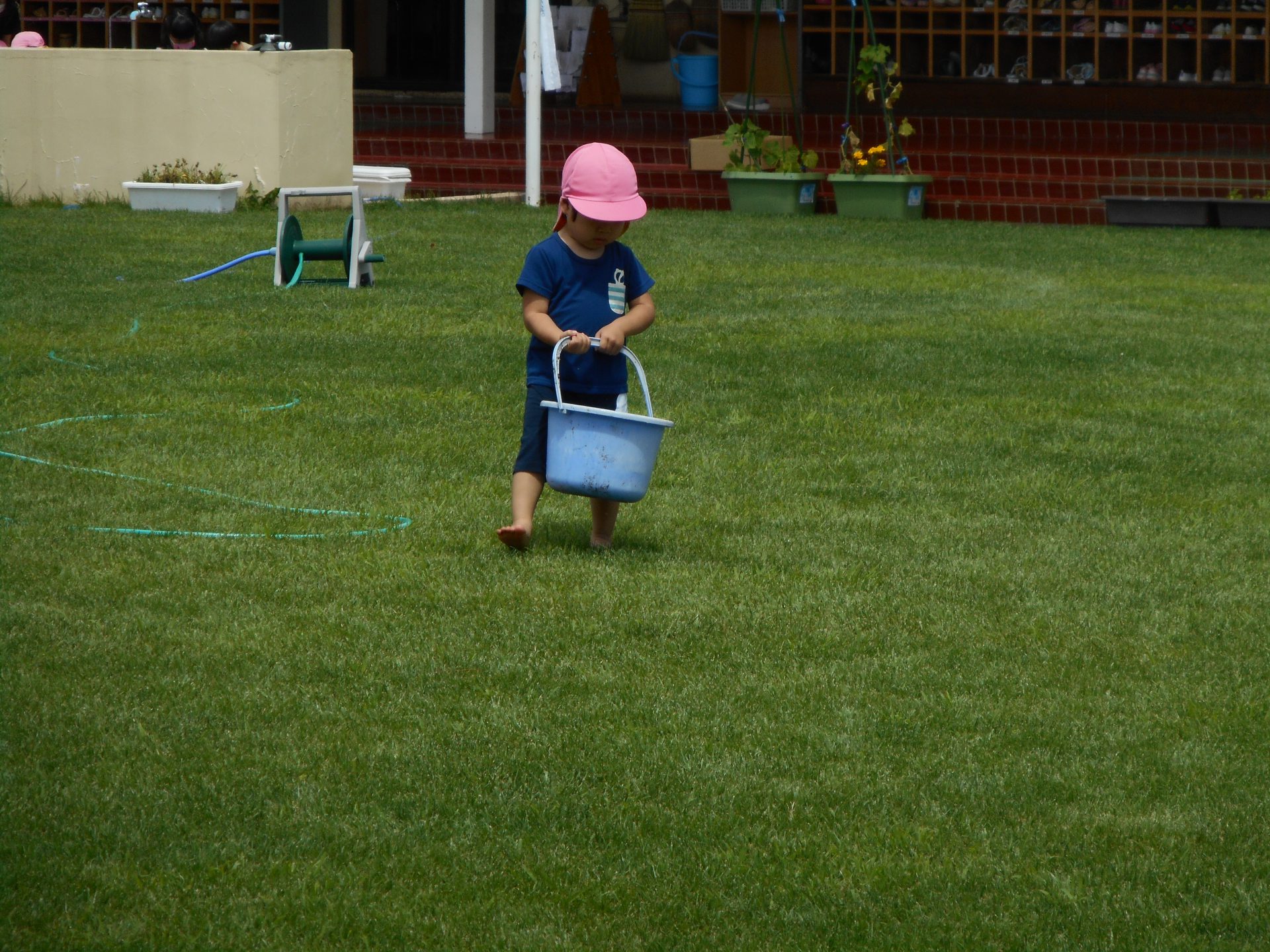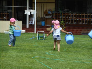 「ぼくもー」「わたしもー」とバケツに水を入れて運びます。