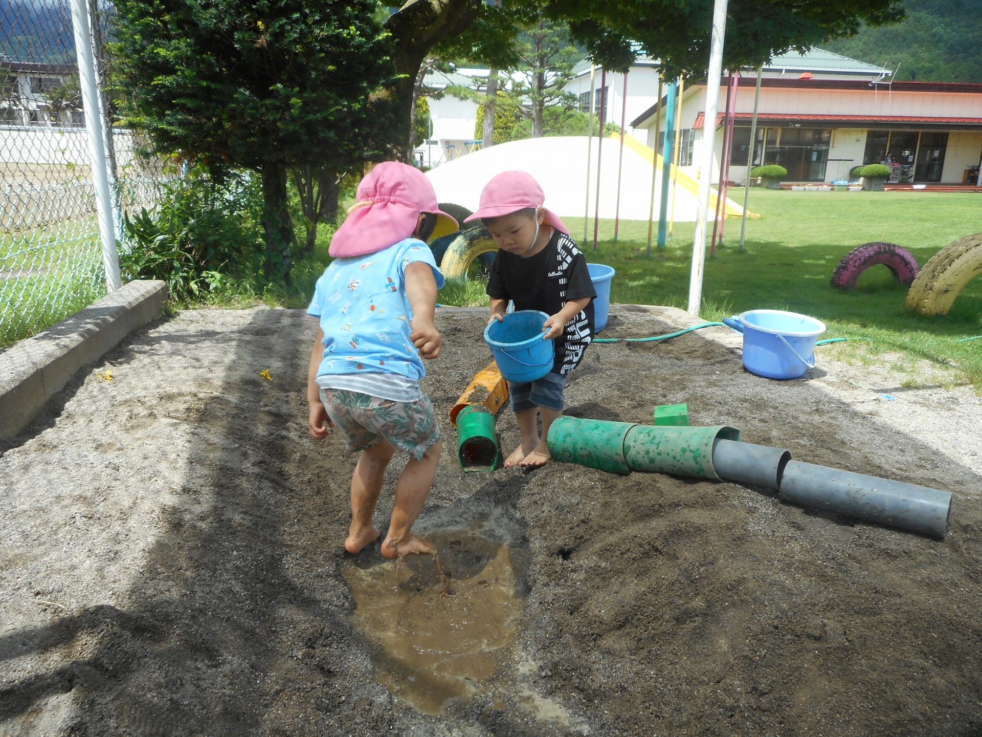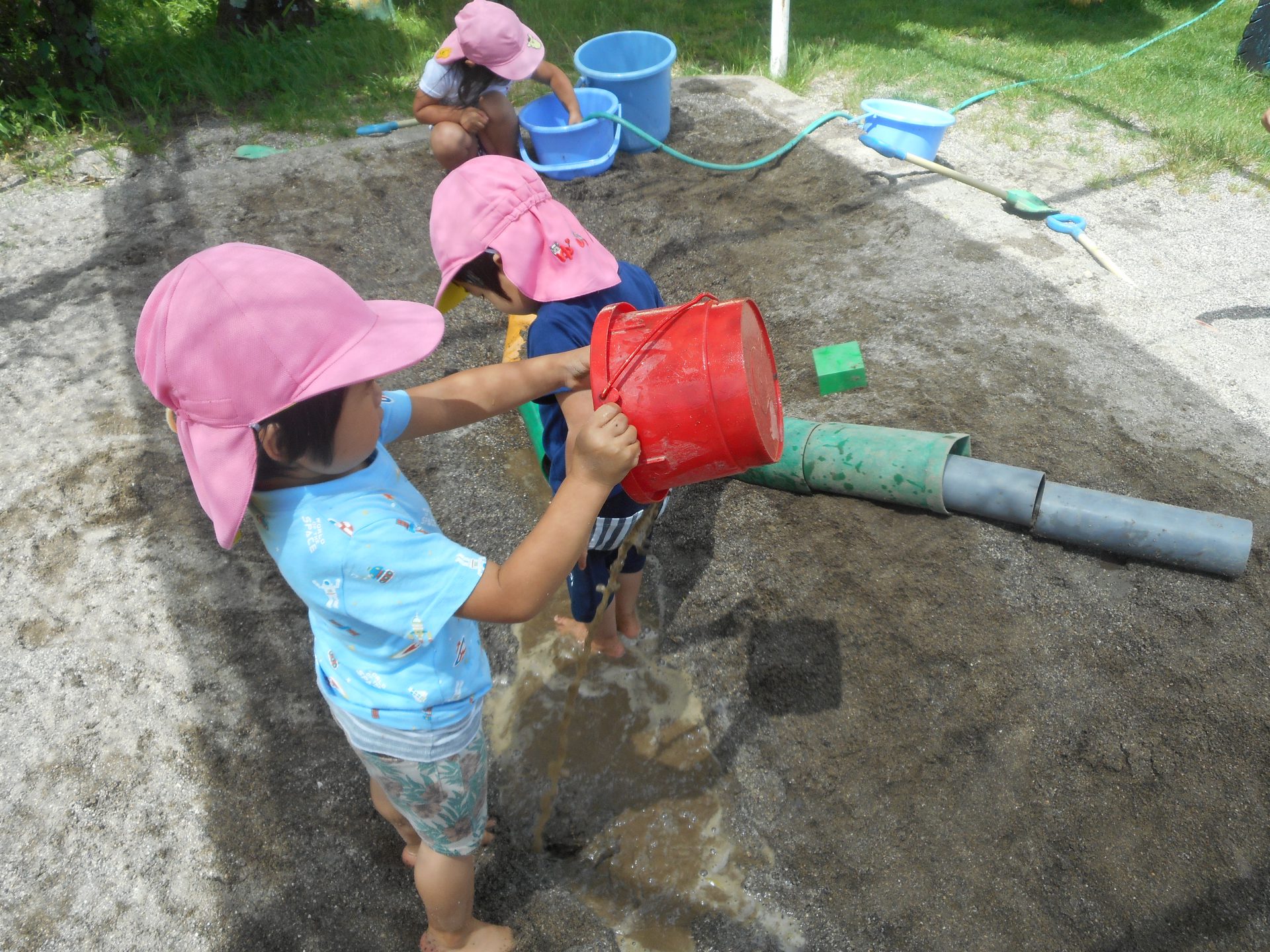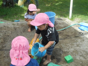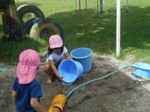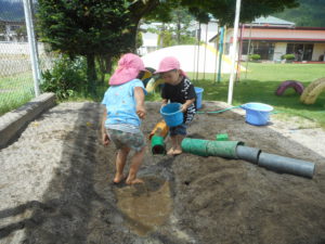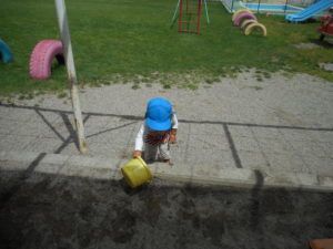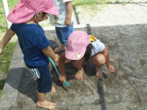水遊びが楽しい季節です。天気が良い日、「今日は大きい砂場に水を入れて遊ぼう!」と裸足になって外に飛び出して行きました。