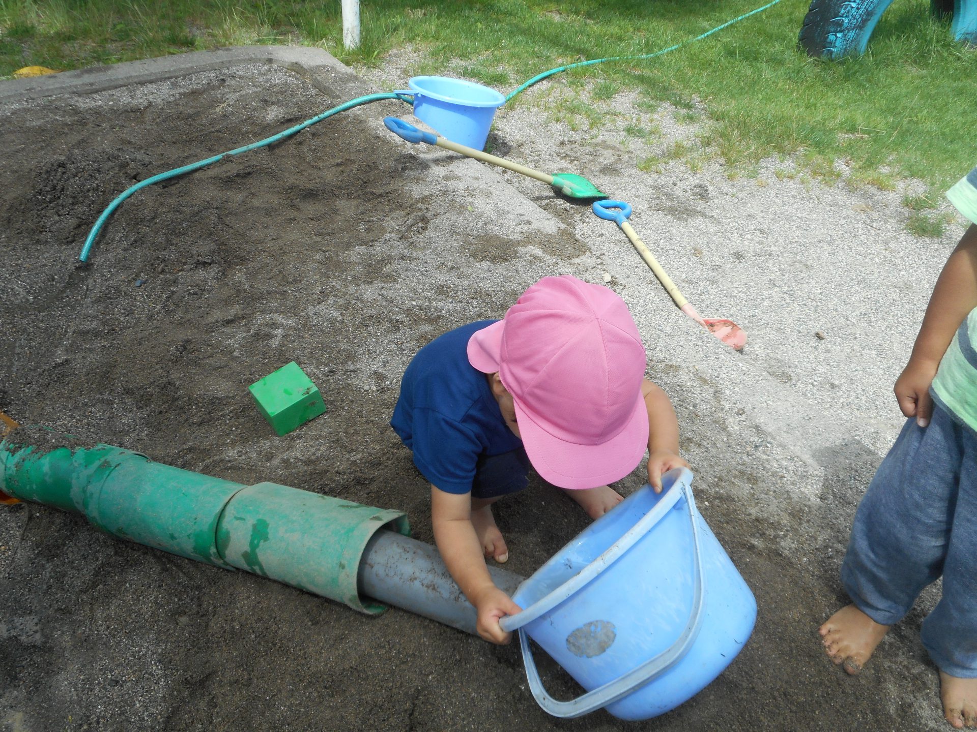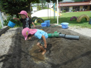 砂場は水道から遠く、ホースをつなげて砂場に水を引きますが、沢山出すとホースがすぐに抜けてしまうので少ししか水が出せません。それに、すぐ水を吸ってしまう砂場、思うようになりません…。