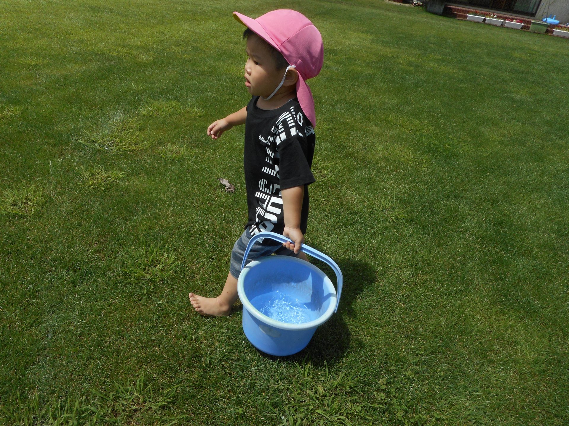 バケツに水を入れて運ぼうと、大きなバケツを持ち出しましたよ。