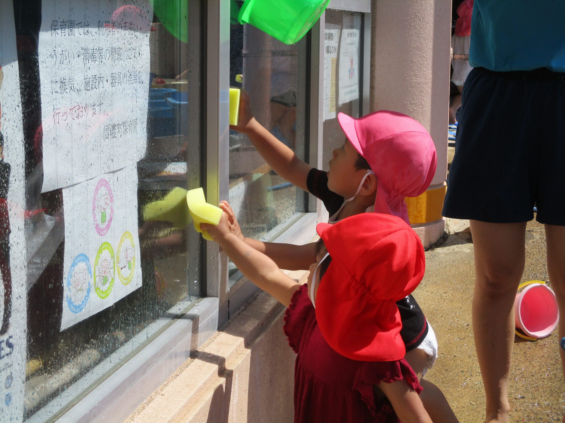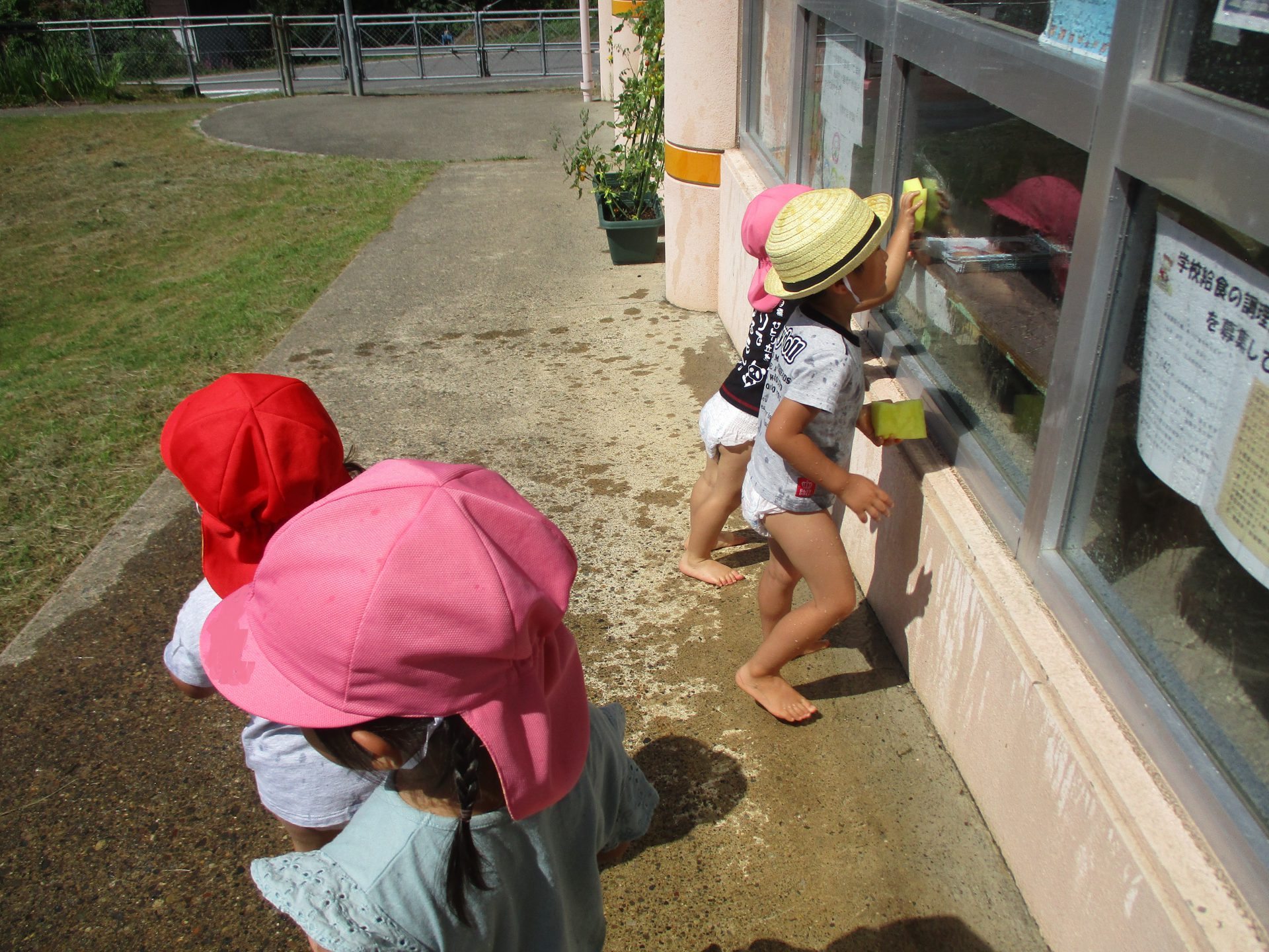 手にスポンジを持ったお掃除部隊がやってきました。スポンジにたくさん水を含ませてガラス窓のお掃除。