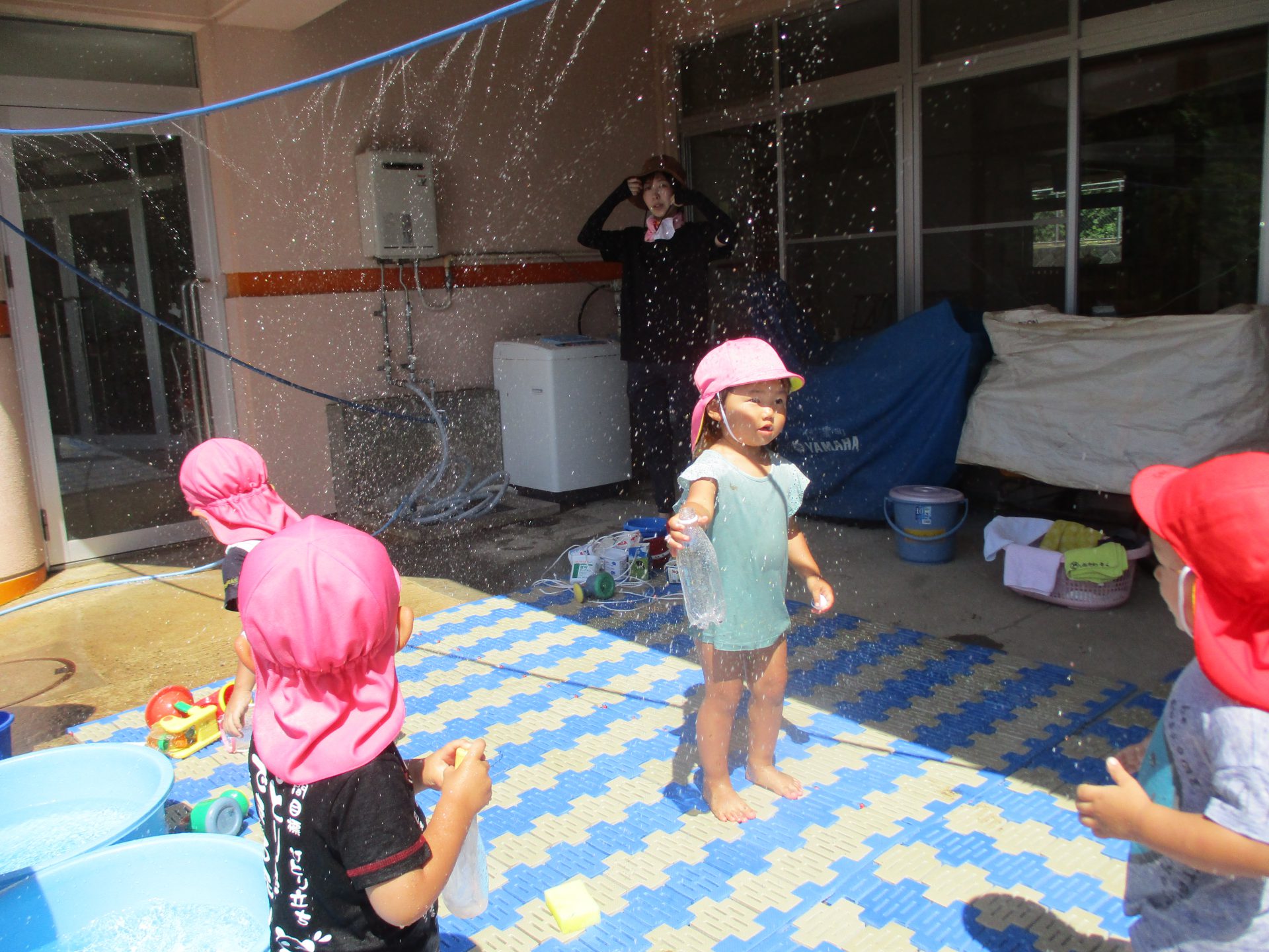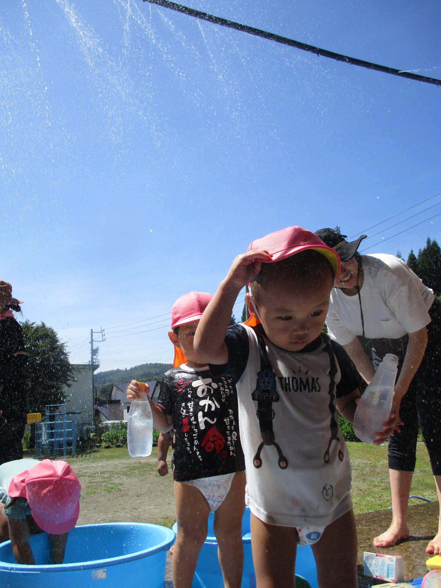 水を出すとキャーと逃げ回る子どもたちでしたがすぐに「きもちー!」とシャワーの下に集まってきました。
