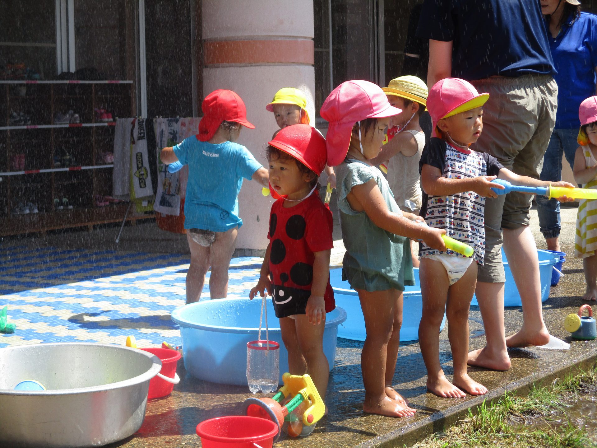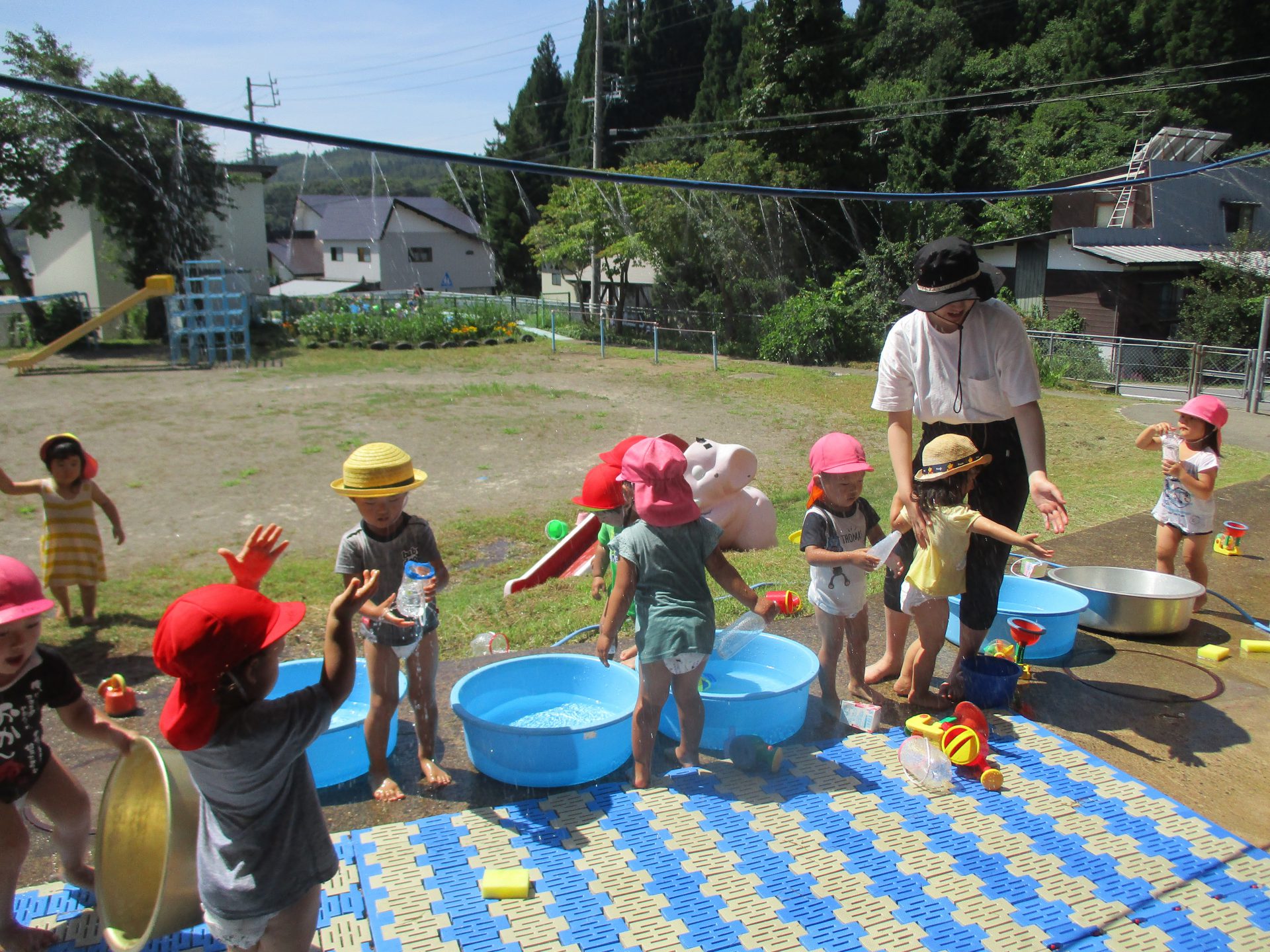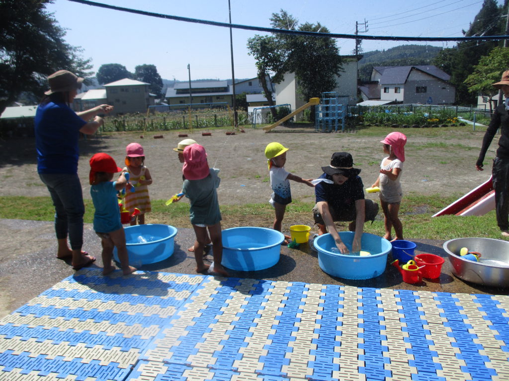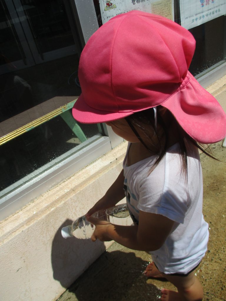はじめは顔に水がかかるのが怖く泣き出してしまうお友達もいましたが、最後には多少水がかかっても平気な様子の子どもたちでした。毎日のように水遊びを楽しみすっかり水と仲良しになったようです。