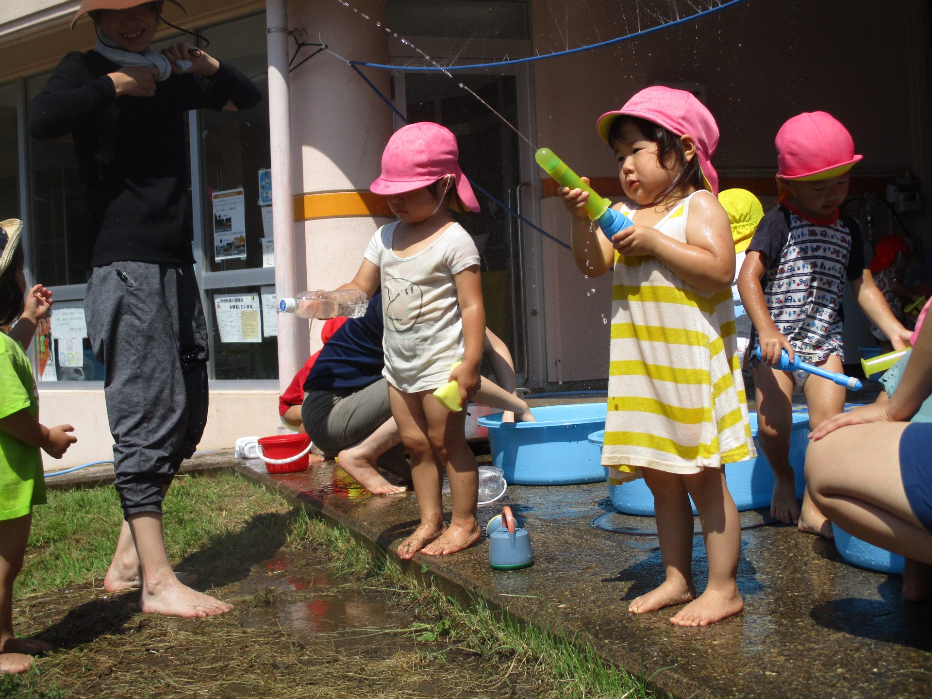 ペットボトルやマヨネーズの空き容器など様々な形をした水鉄砲で遊ぶのが得意な子どもたちです。