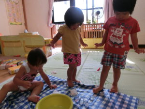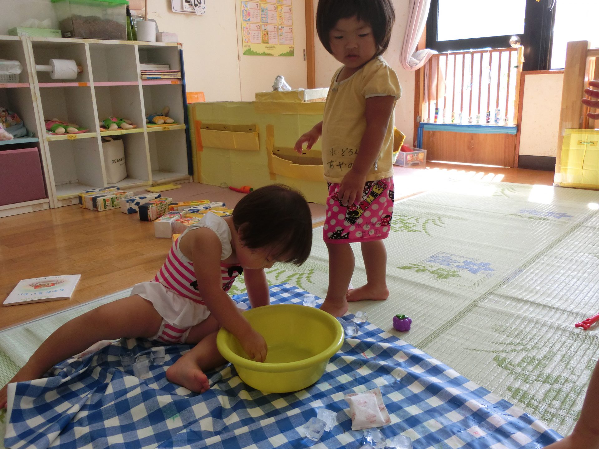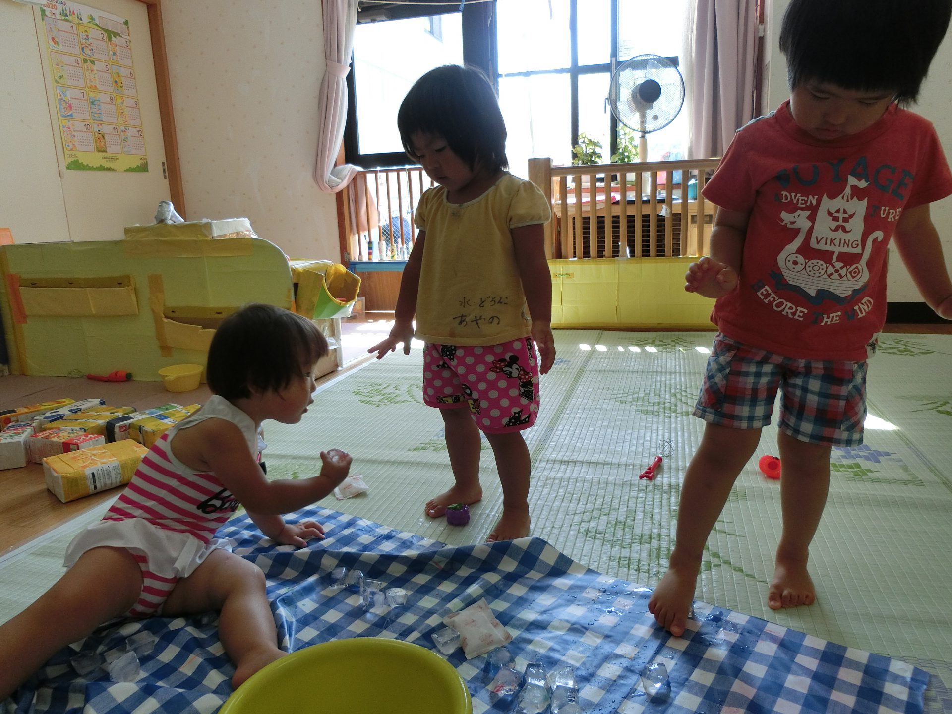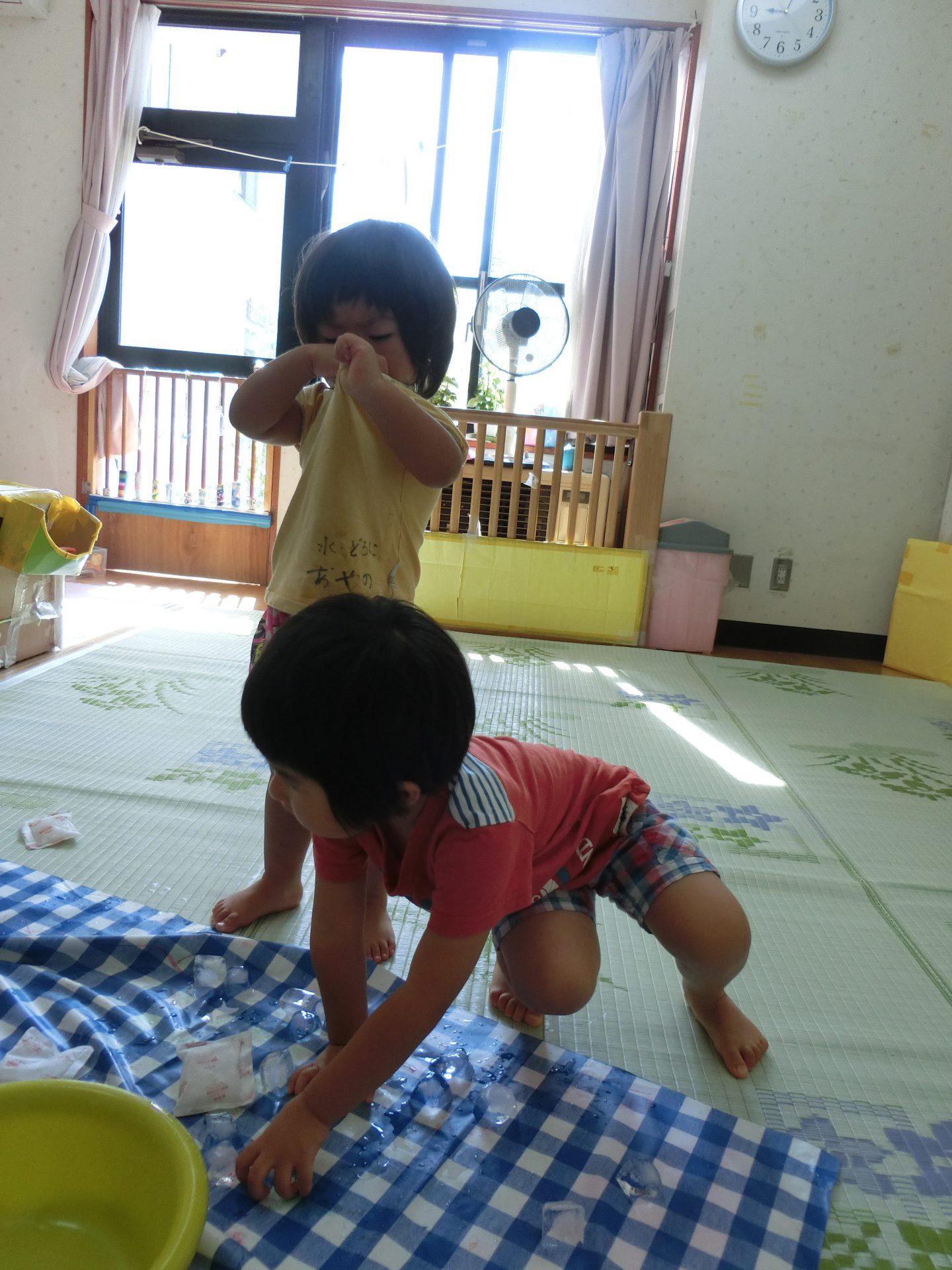 表情豊かに冷たさを表現し、足やお腹、頭などにつけて、冷たさや滑る感触、溶けて水になる事を楽しんでいました。