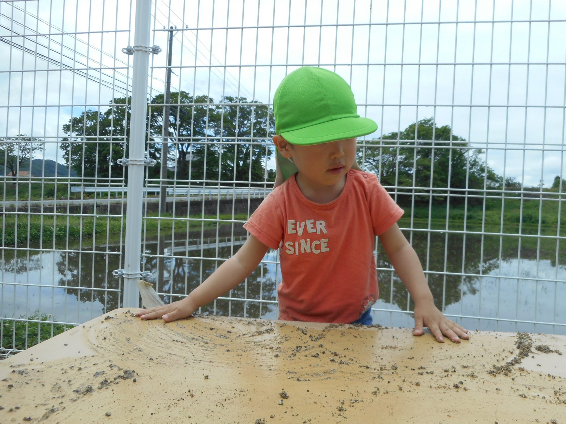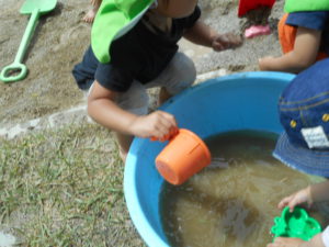 テーブルに水と砂をまき、ざらざらした感触を味わいました。