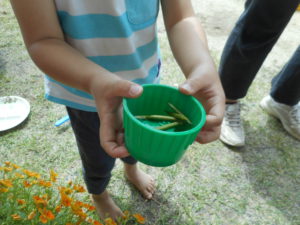 カラスノエンドウを見つけ、「ごはんにいれるね。」と遊びだし、