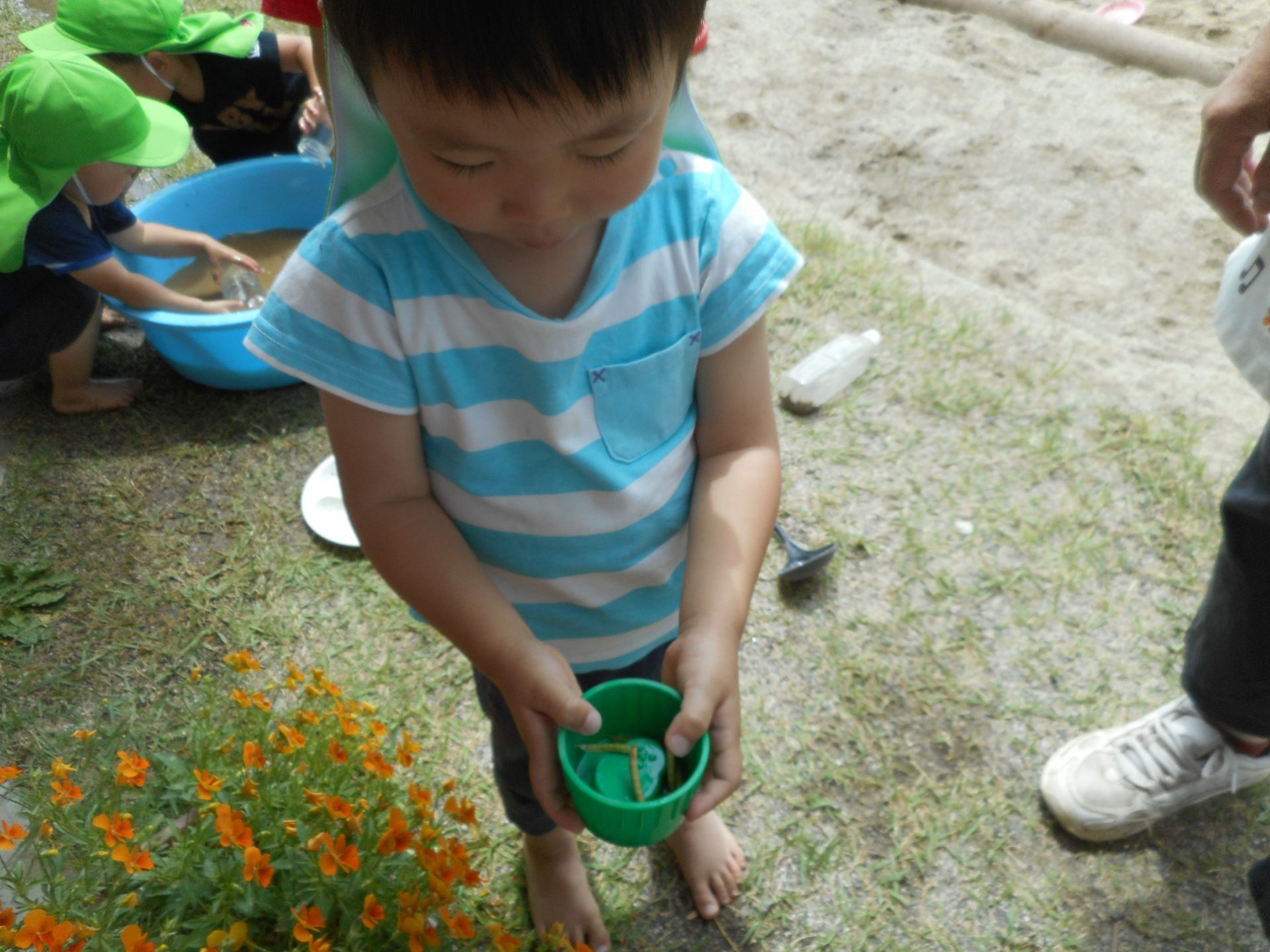 毎日遊んでいる庭で自然を身近に感じ、見たり触れたりして日々発見や気づきがあると感じます。