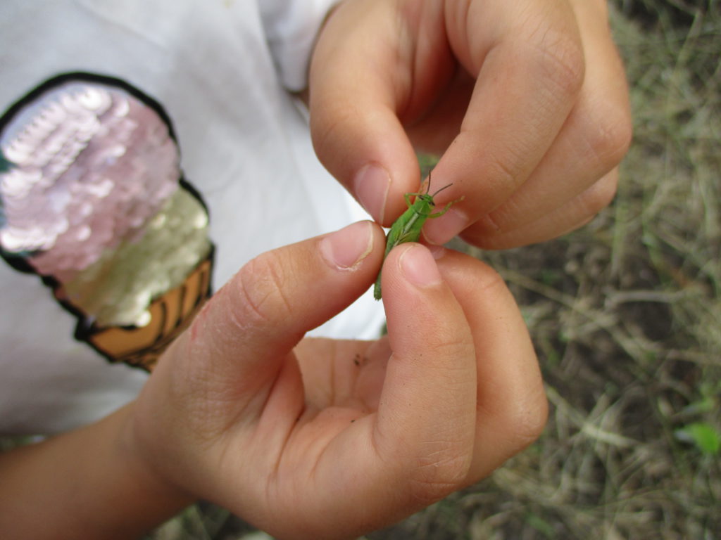 わくわく広場で生きているバッタを捕まえてはケースに入れています。