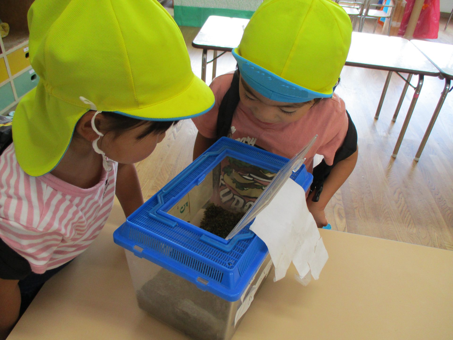 カップに入れてじっと観察する子も。「目が閉じてる‥」「動かないね。」
