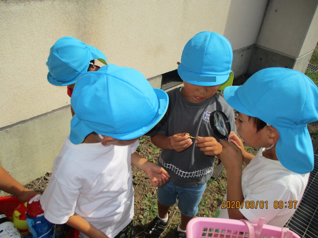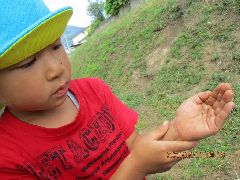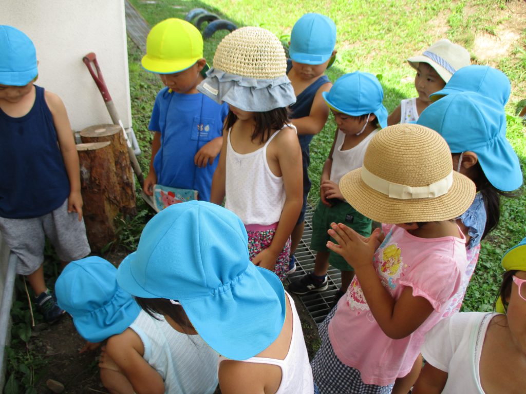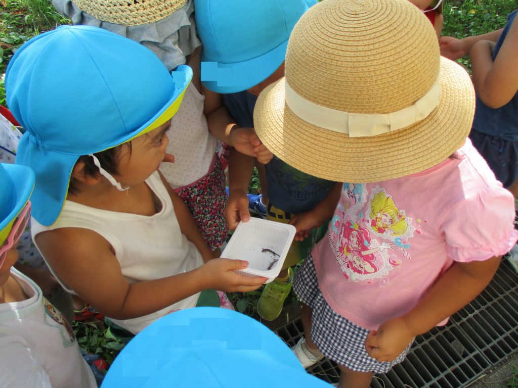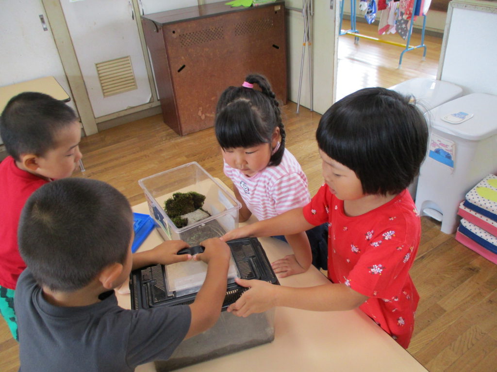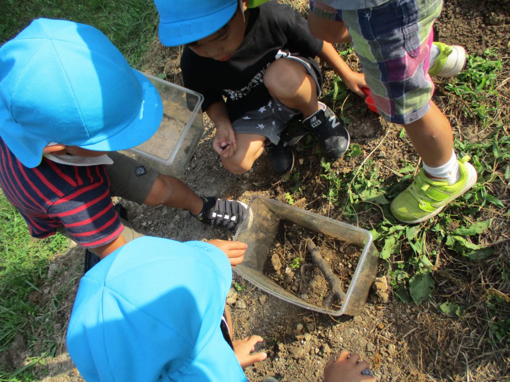 そんな自然の中で年中組の子どもたちは虫探しをしたり、捕まえて調べてみたり、飼ってみたり‥生き物とたくさん触れ合っています。