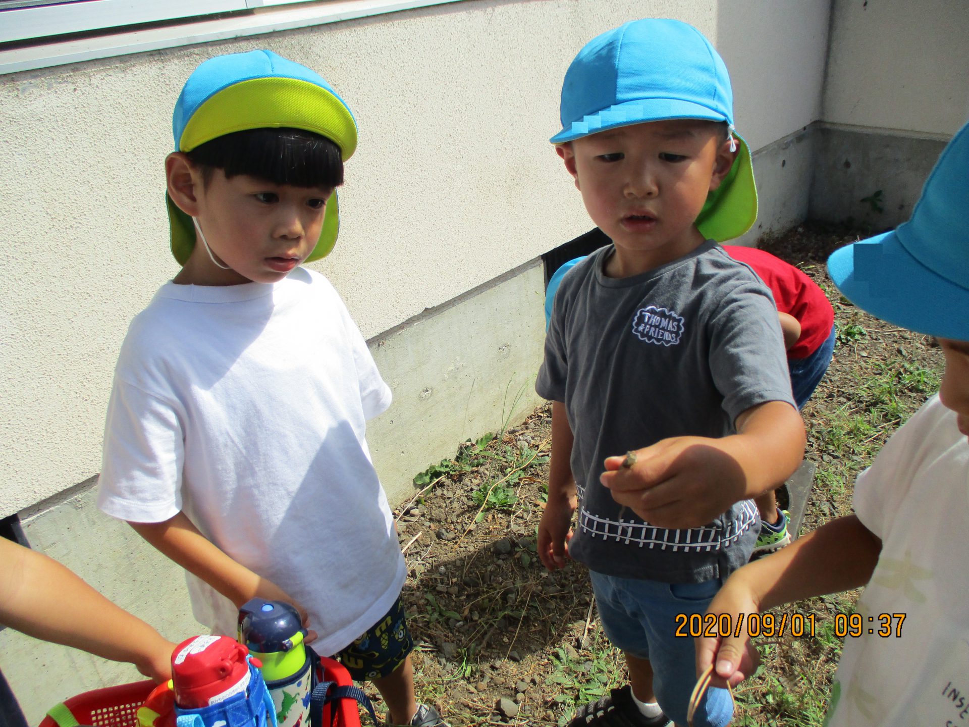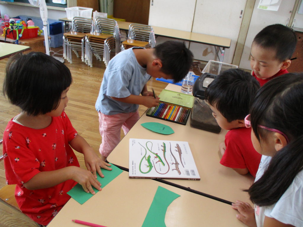 見つけるとすぐに「かんちゃんの色とそっくり!」「かんちゃんの子どもかもしれないよ!」「きっとかんちゃんに会いたくてきたんじゃない??」と子どもたち同士で盛り上がっていました。どうやら、飼っているカナヘビの中の1匹、かんちゃんと色が似ていたようです。