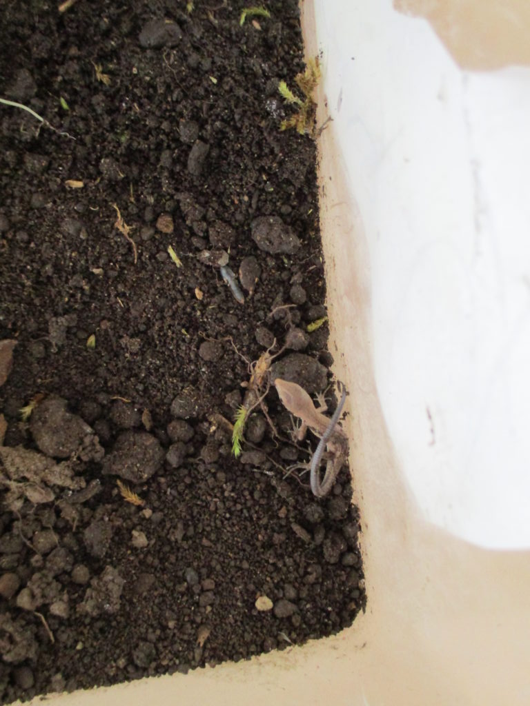 お腹の大きくなってきたカナヘビを見て、「赤ちゃん生まれてくるようにバッタをたくさん入れなきゃね!」と張り切ってバッタを捕まえてはいれて、いたある日‥