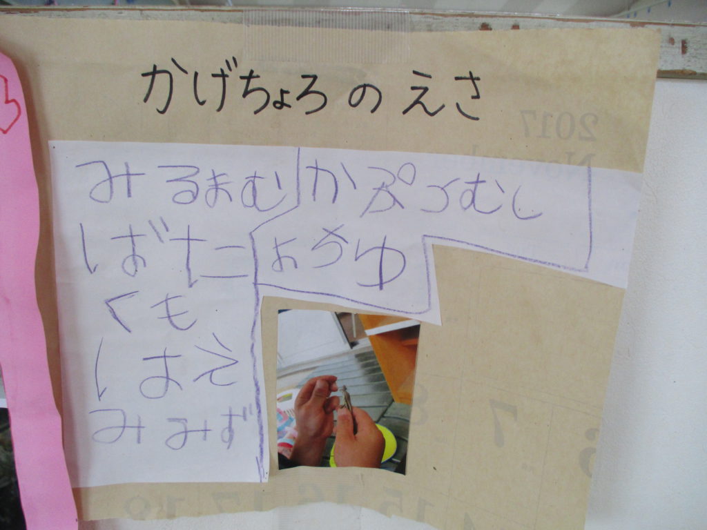 「生きてる虫しか食べないんだって!」早速書いて貼ってくれる子もいました。