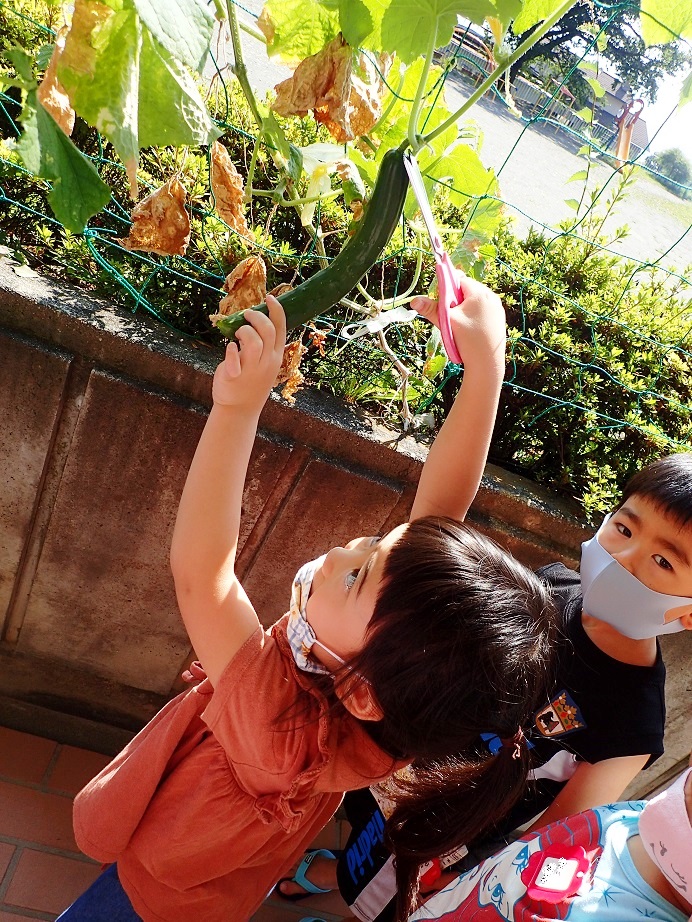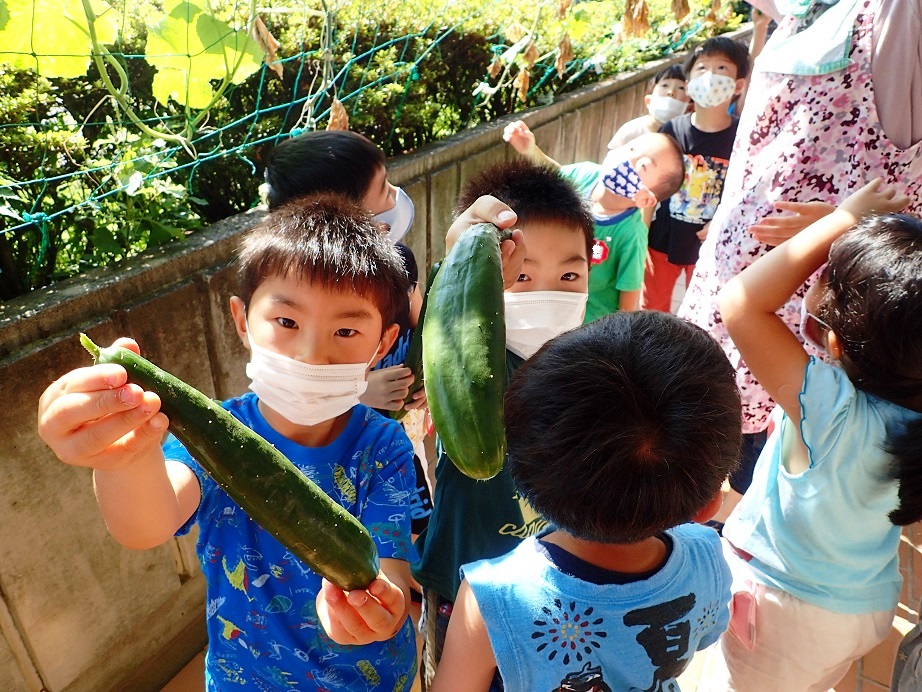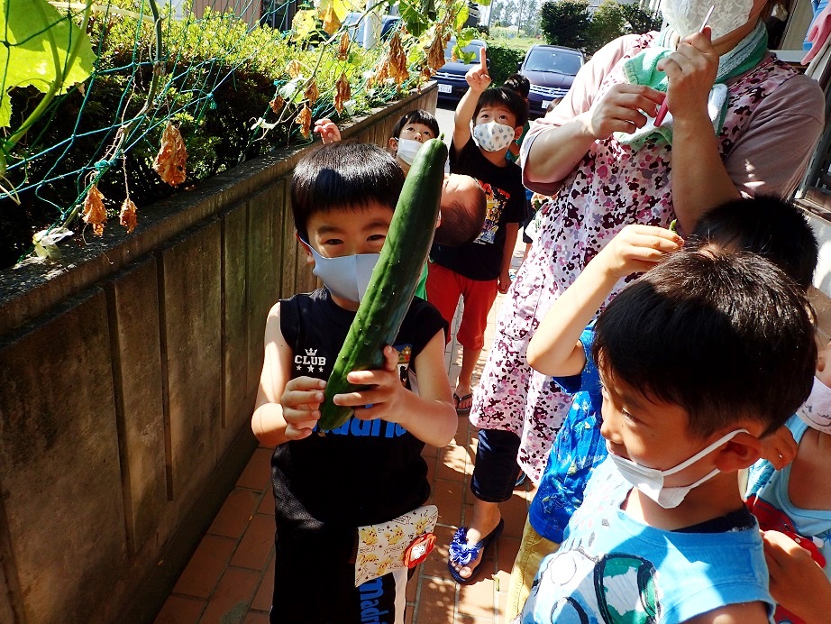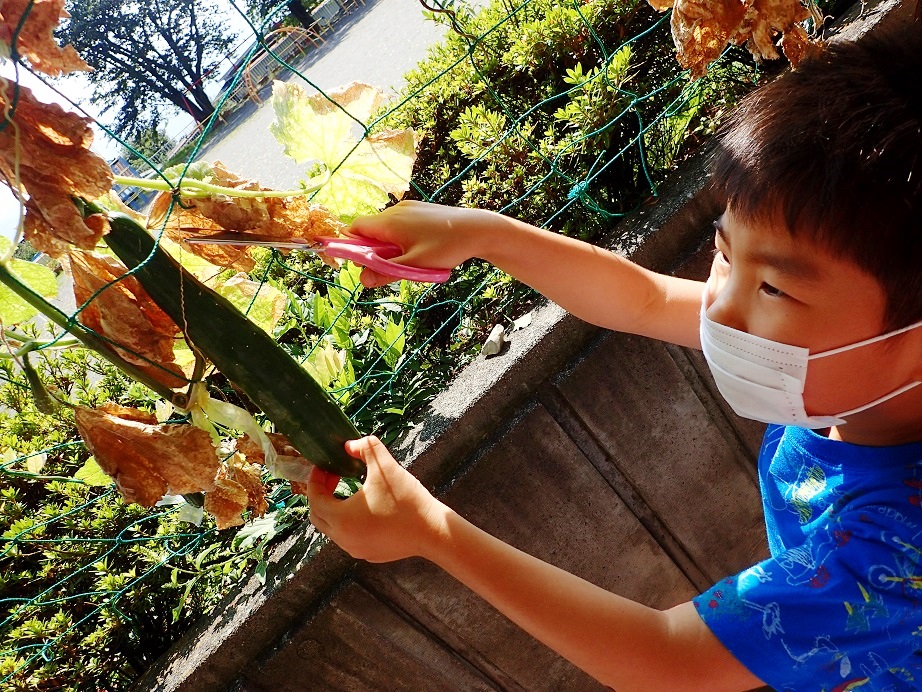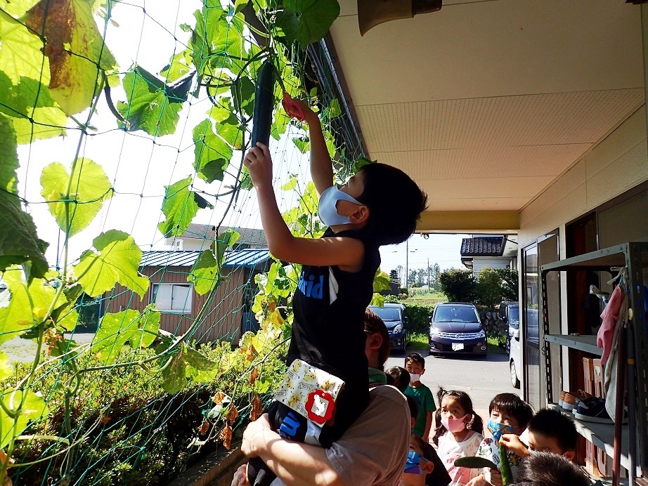 高いところにあるきゅうりには保育士が抱き上げて子供たちが自分で収穫する体験をさせるようにしました。自分が収穫したという嬉しさを味わってほしいと思いました。