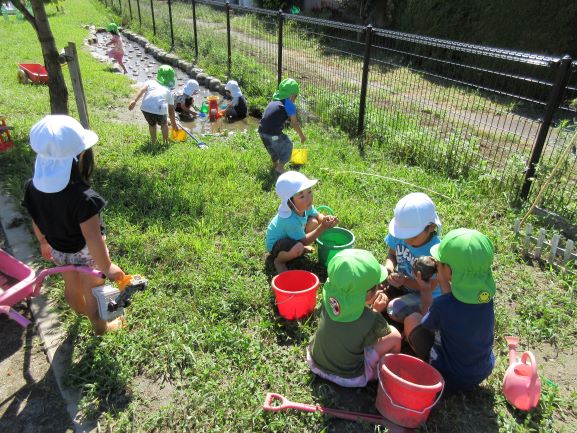 秋空の下、保育園のビオトープでは水遊びが大盛況!