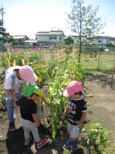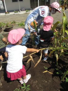 園の畑でトウモロコシが実ったので、トウモロコシを茎から”もぐ”こと、皮をむくことを経験し、その中で虫さんと出会い、ビックリしましたが生き物なので大切に接する優しい心を育みました。