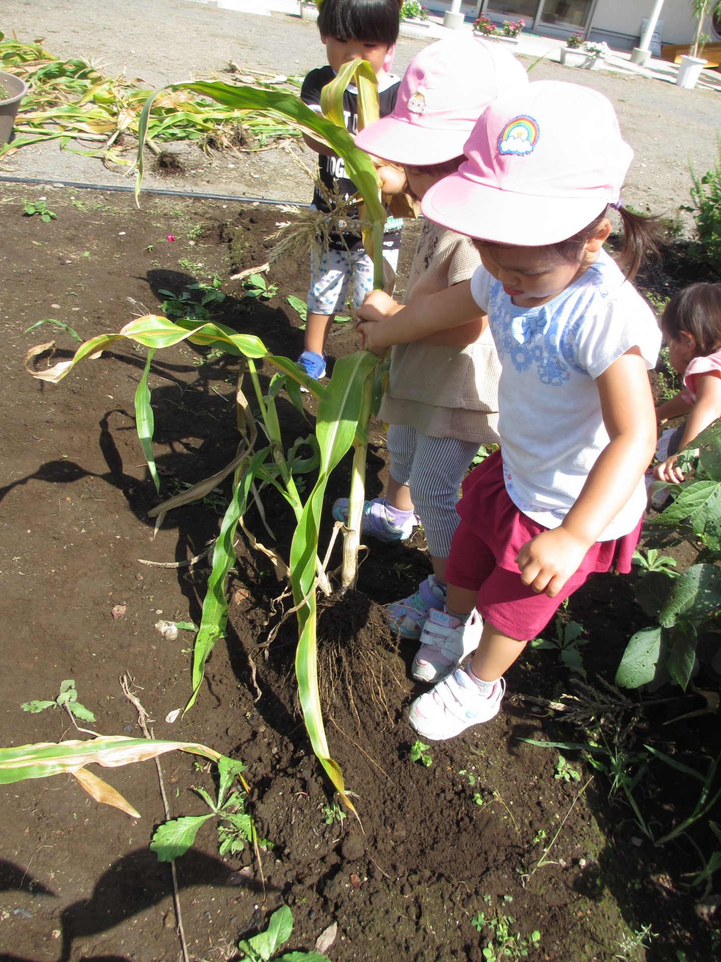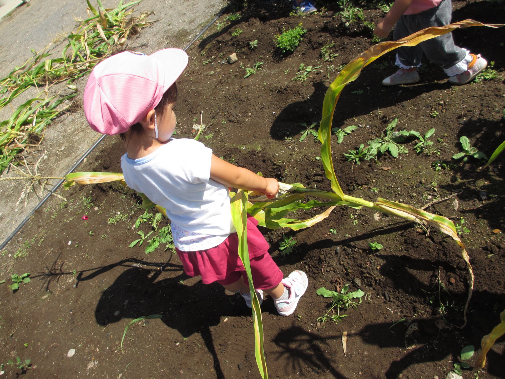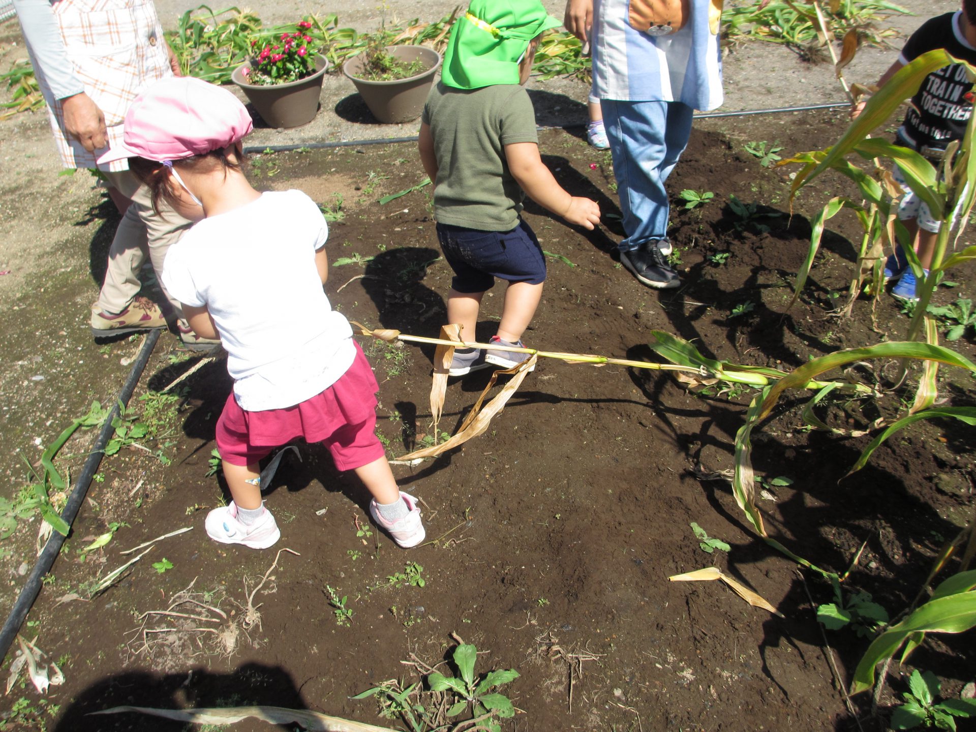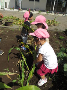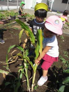 普段から、お片付けをする時も自然と子ども達から、『うんとこしょ、どっこいしょ。』が出てくるので、トウモロコシの茎を抜く時に、絵本のような”かぶを抜く”疑似体験ができればと思い活動しました。