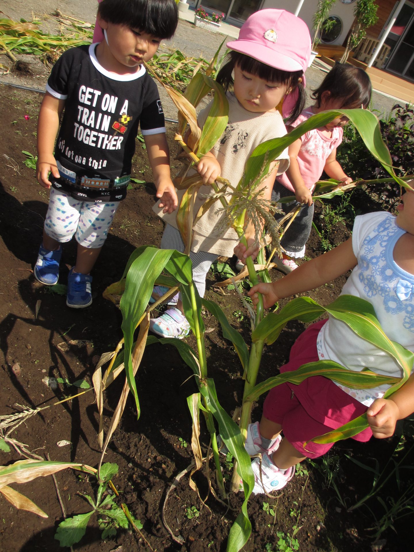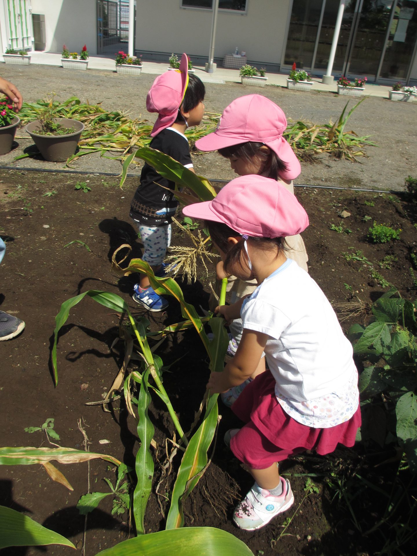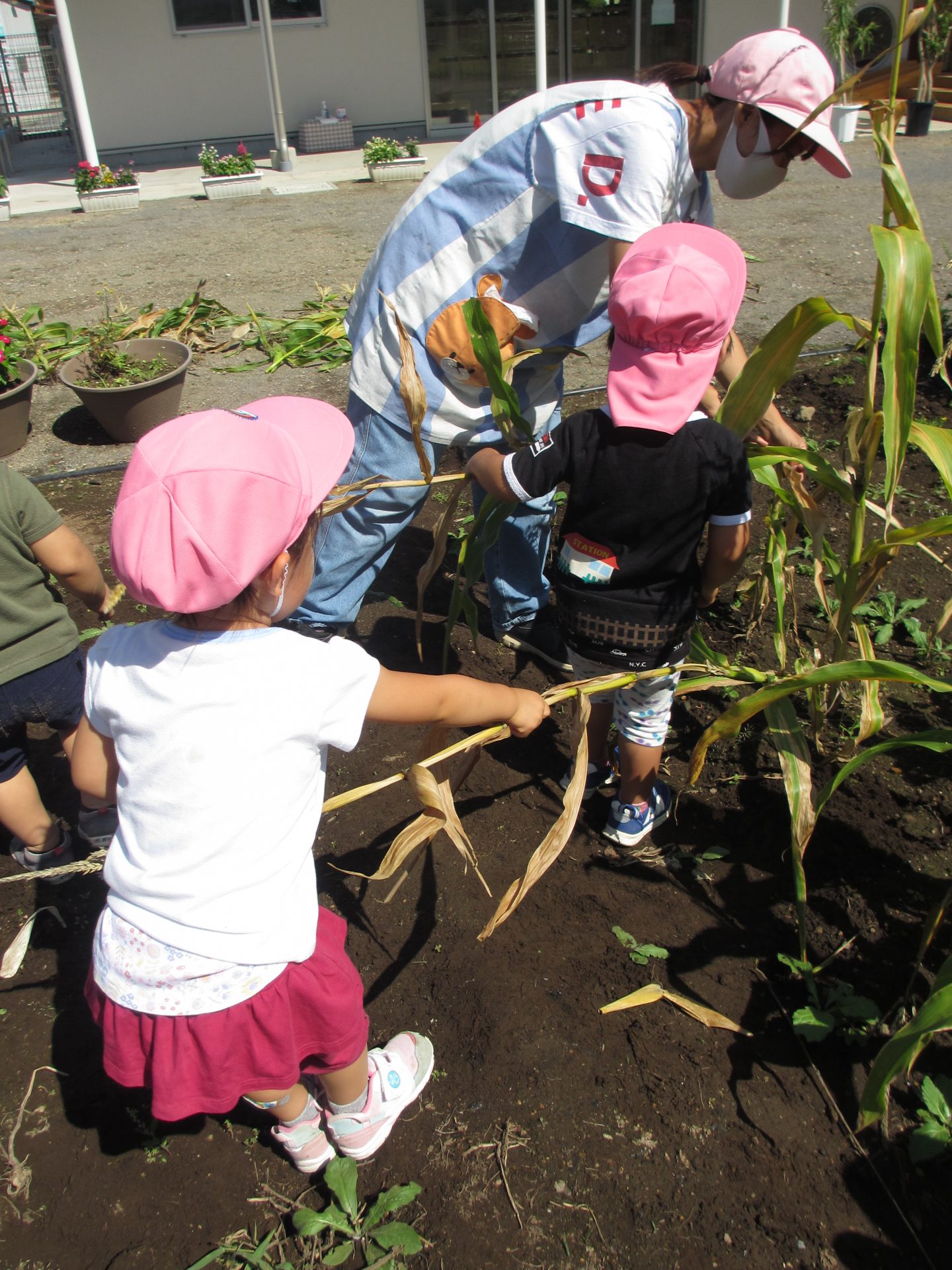 普段から、お片付けをする時も自然と子ども達から、『うんとこしょ、どっこいしょ。』が出てくるので、トウモロコシの茎を抜く時に、絵本のような”かぶを抜く”疑似体験ができればと思い活動しました。