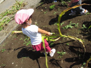 子ども達は、日頃から【おおきなかぶ】の絵本の『うんとこしょ、どっこいしょ。』が大好きで、普段の生活の中でお片付けをする時にも、自然と子ども達から『うんとこしょ、どっこいしょ。』が聞こえてきます。この日も、『うんとこしょ、どっこいしょ。』と言いながら、楽しく抜きました。