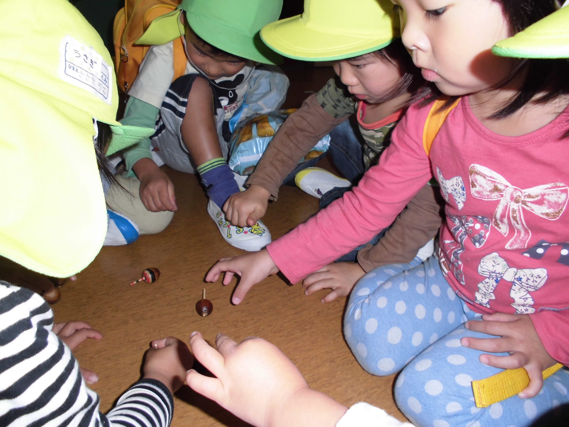 お散歩や園庭で思い切り遊ぶ子ども達、おじいちゃん先生にどんぐりコマを作ってもらい、回せるようになりました。