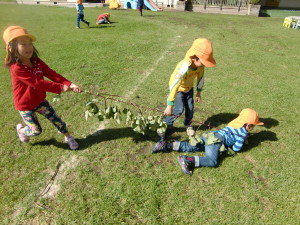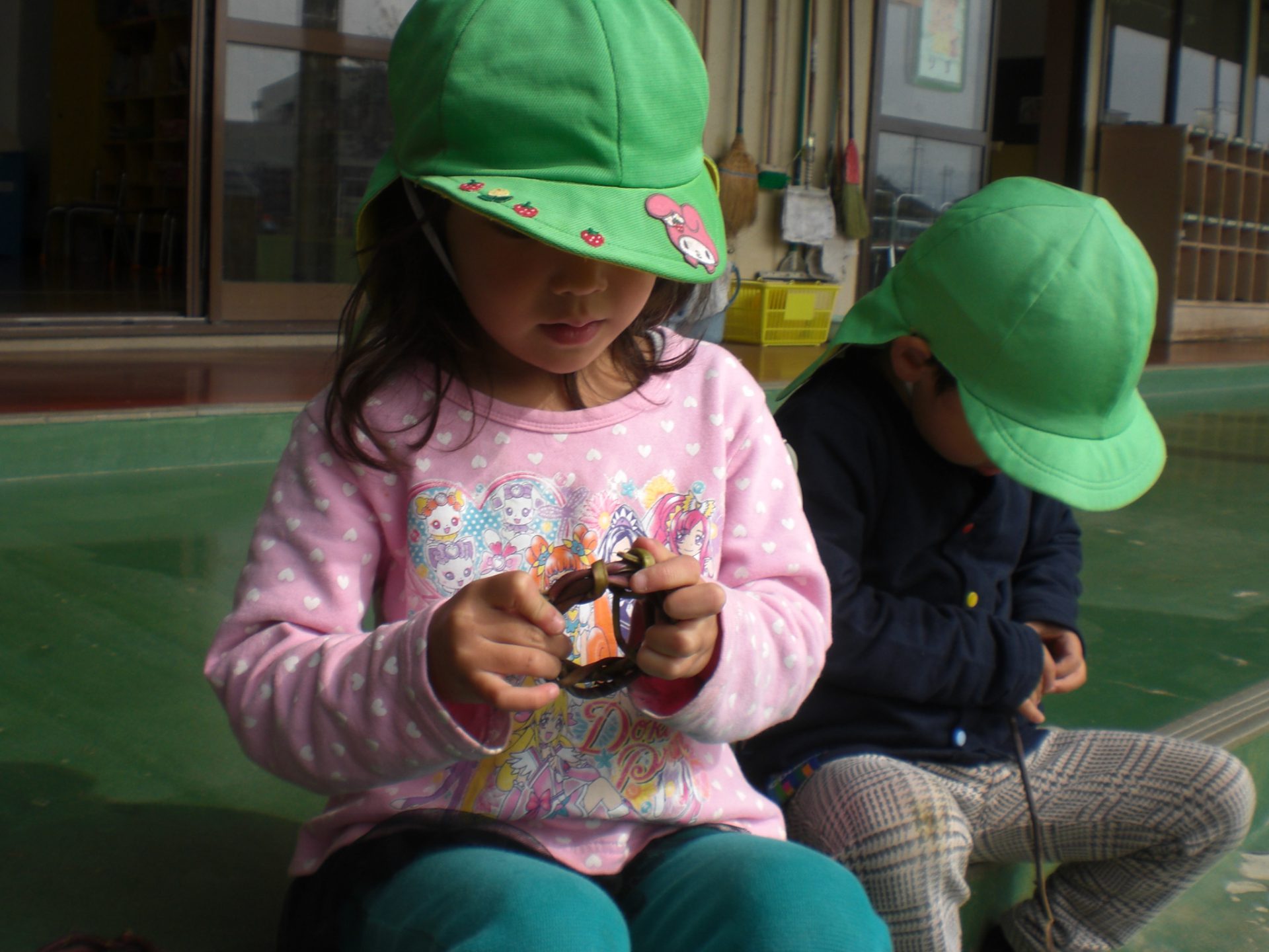 おいも掘りの前日、年中さんがつるで遊んでいました。先生が「そのつるでブレスレットができるよ」と教えてくれました。