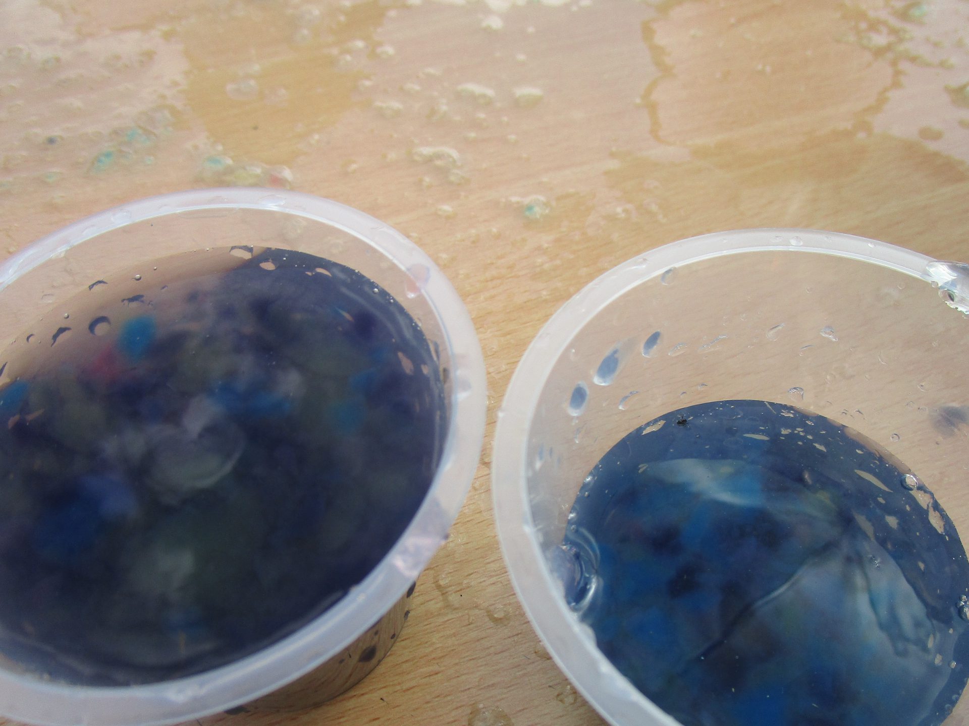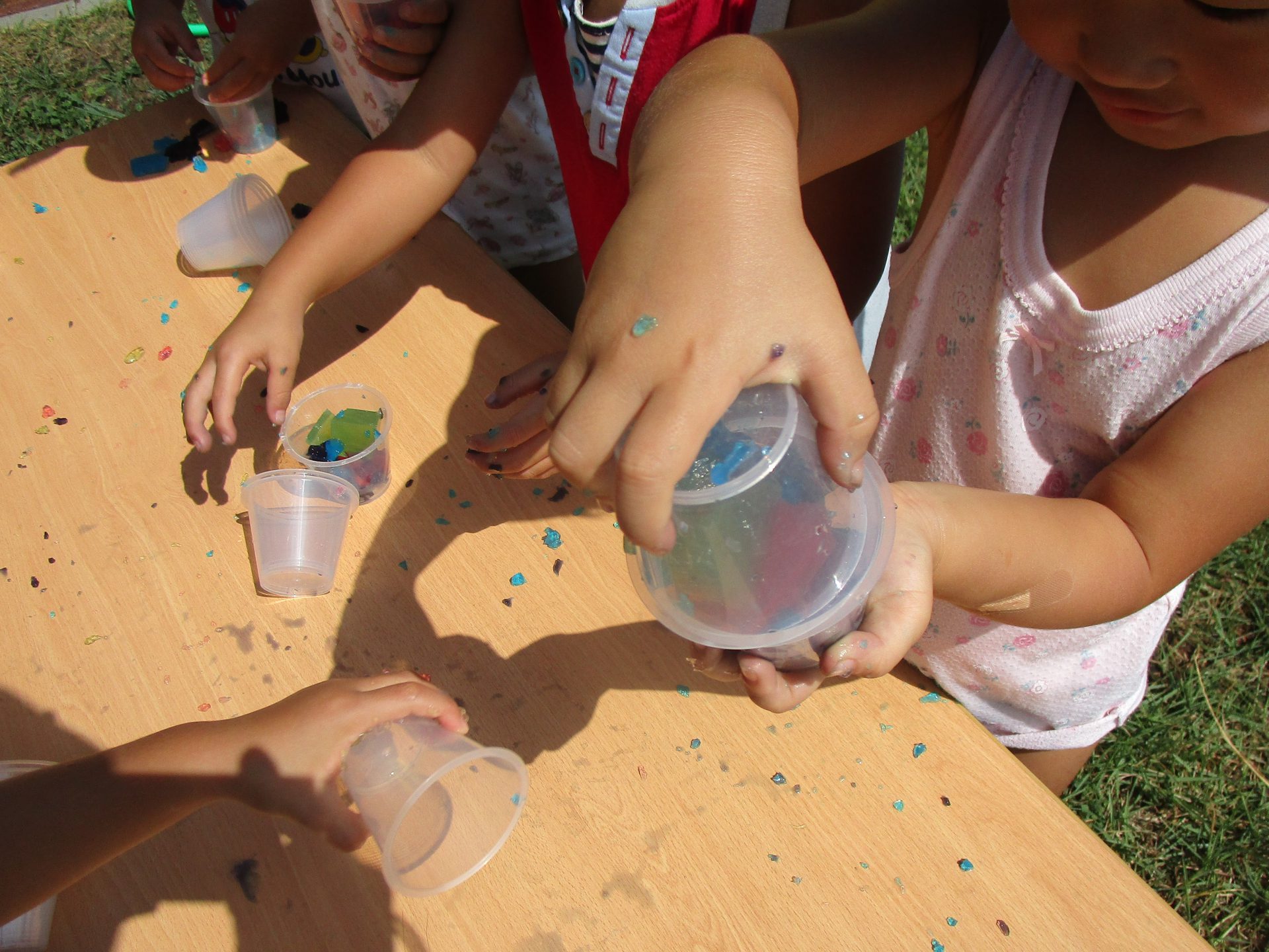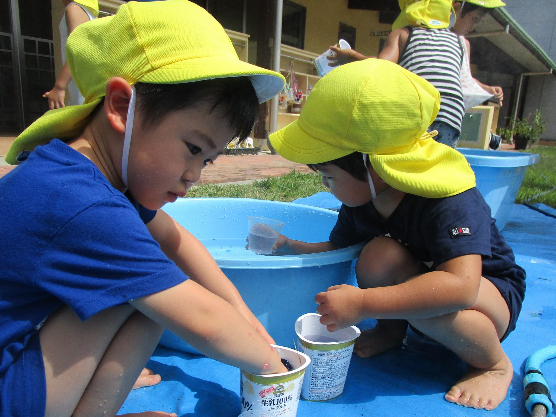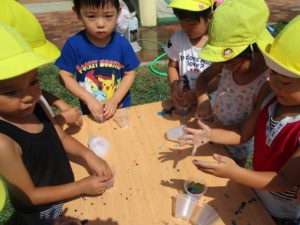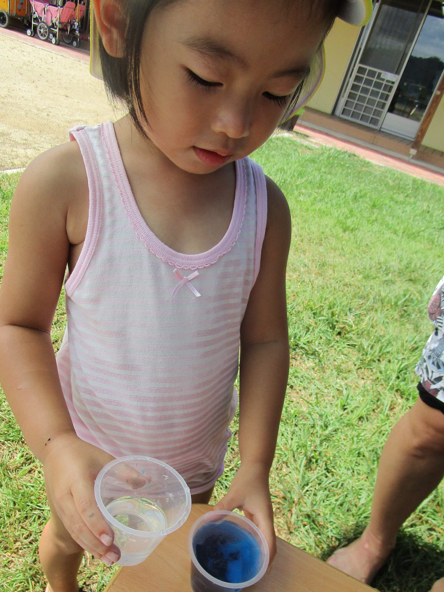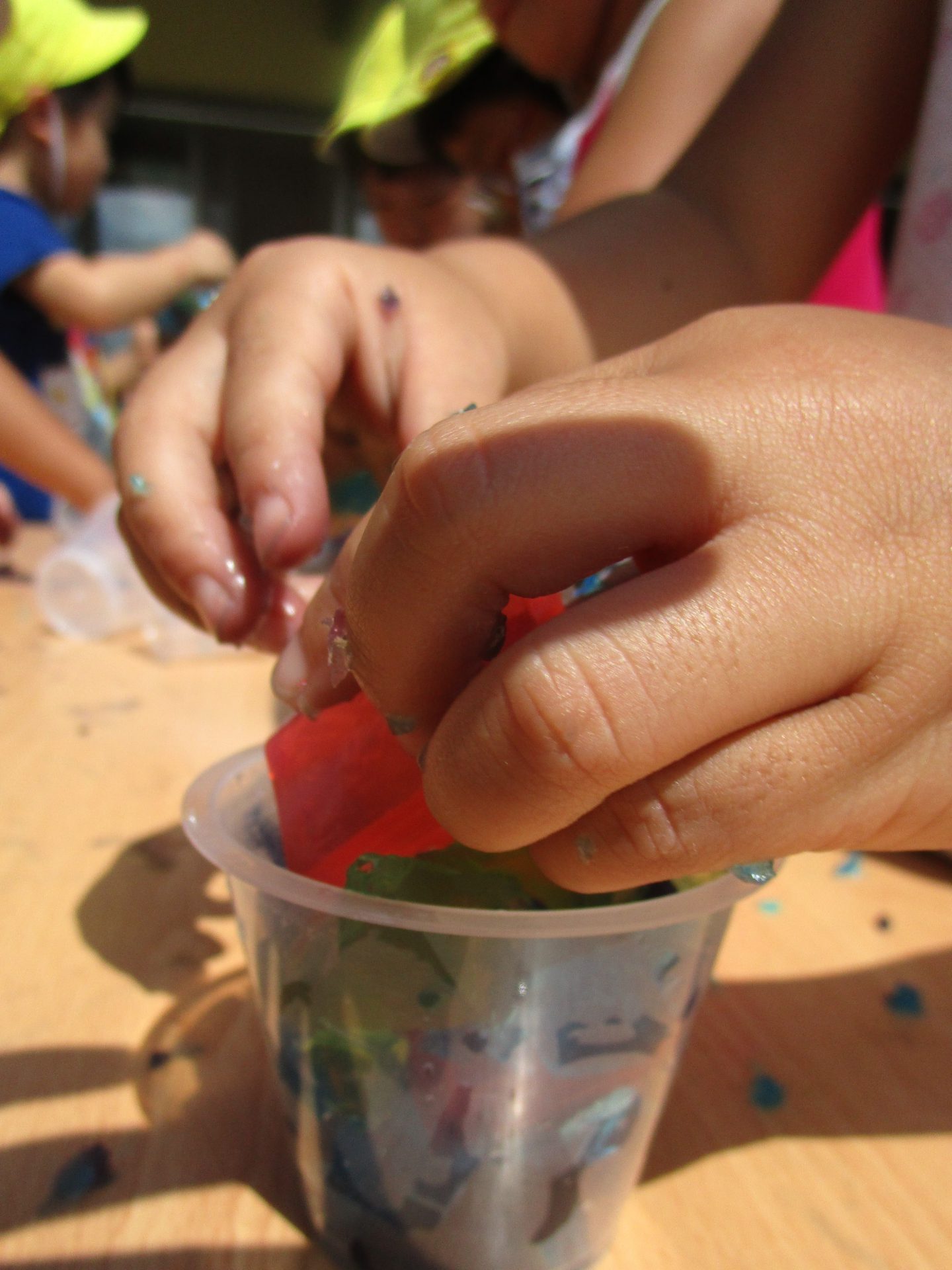 食紅で赤、緑、青、紫に色をつけたゼリー。太陽の光にあたりキラキラ光ってとってもきれい。カップに各々入れてゼリーやさんになったり、様々な色をくだき混ぜてあそびました。水あそびも一緒にしていたのでタライの水の中にゼリーを入れてすくってあそんだり、カップに水を入れてみたり子どもたちは一つの素材を色々にして使って楽しみました。