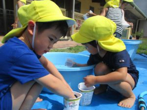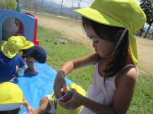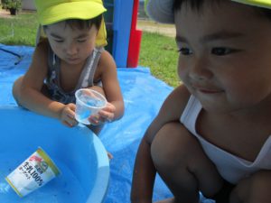 夏ならではの水もとりいれた感触あそび。初めて触る感触に子どもたちの反応は様々でしたが、これからもいろんな物に触れることで「柔らかい」「すべすべ」「気持いい」等、目で見て手で触れ感じる経験を重ねていって欲しいです。