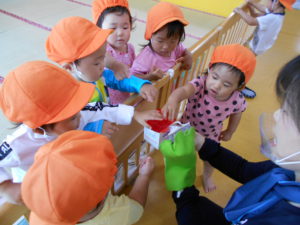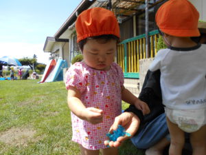 じっと見つめる子、早速触ろうとする子、お友だちの楽しむ雰囲気に刺激を受け、興味を持つ子などがいました。