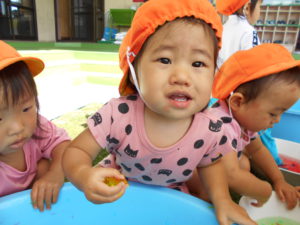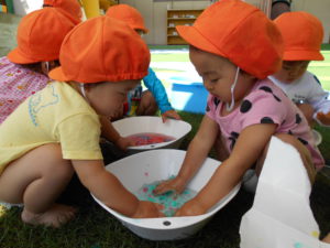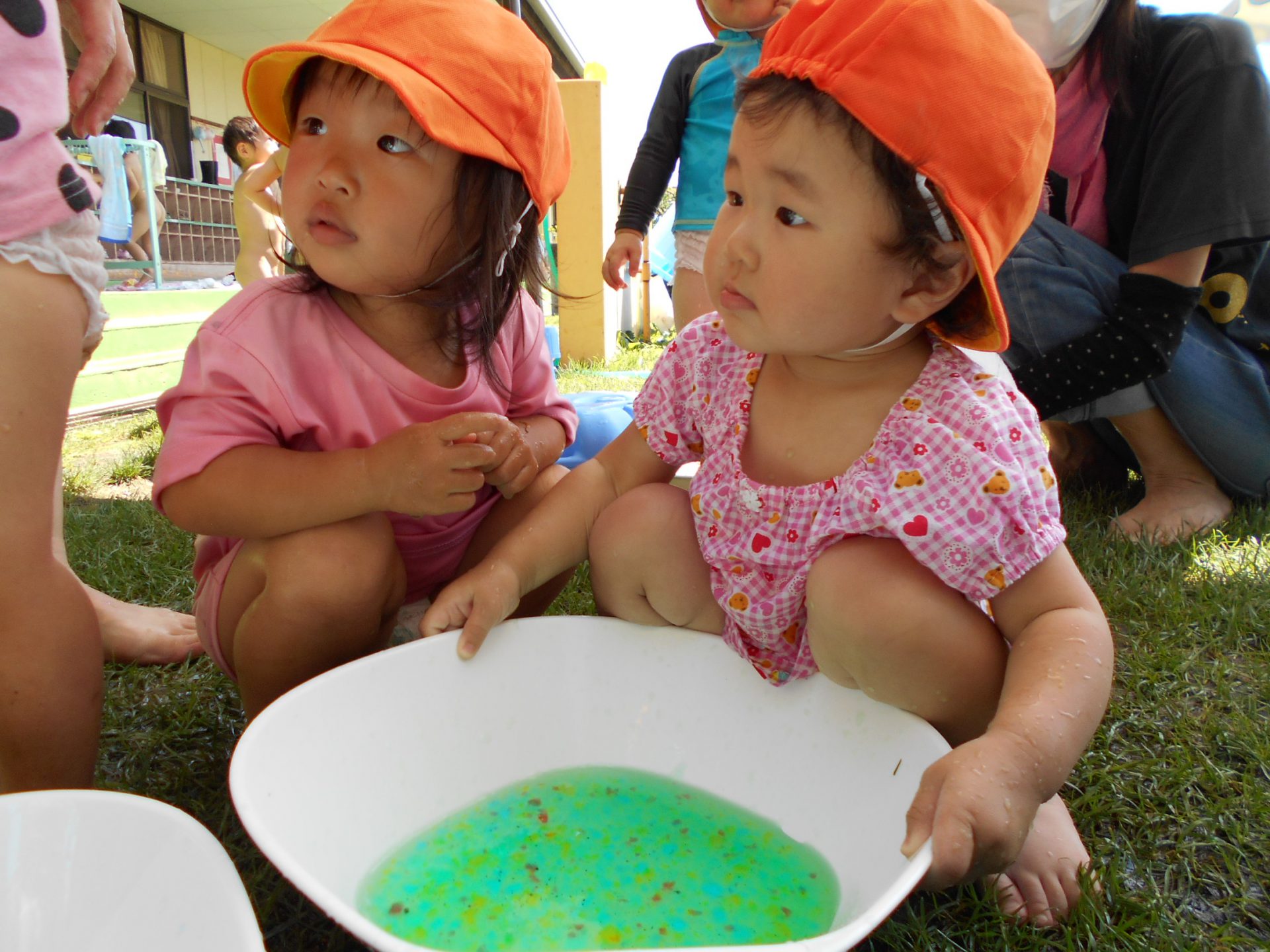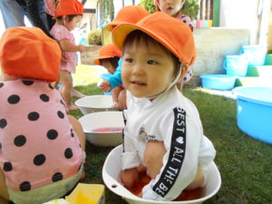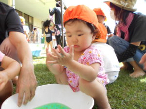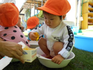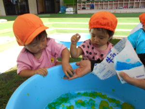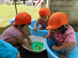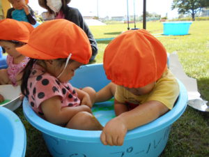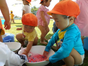 夏には水あそび、プールあそびを楽しんできました。日頃、触れてきた水を加えることであそびも広がり、じっくり触れる姿が見られていました。